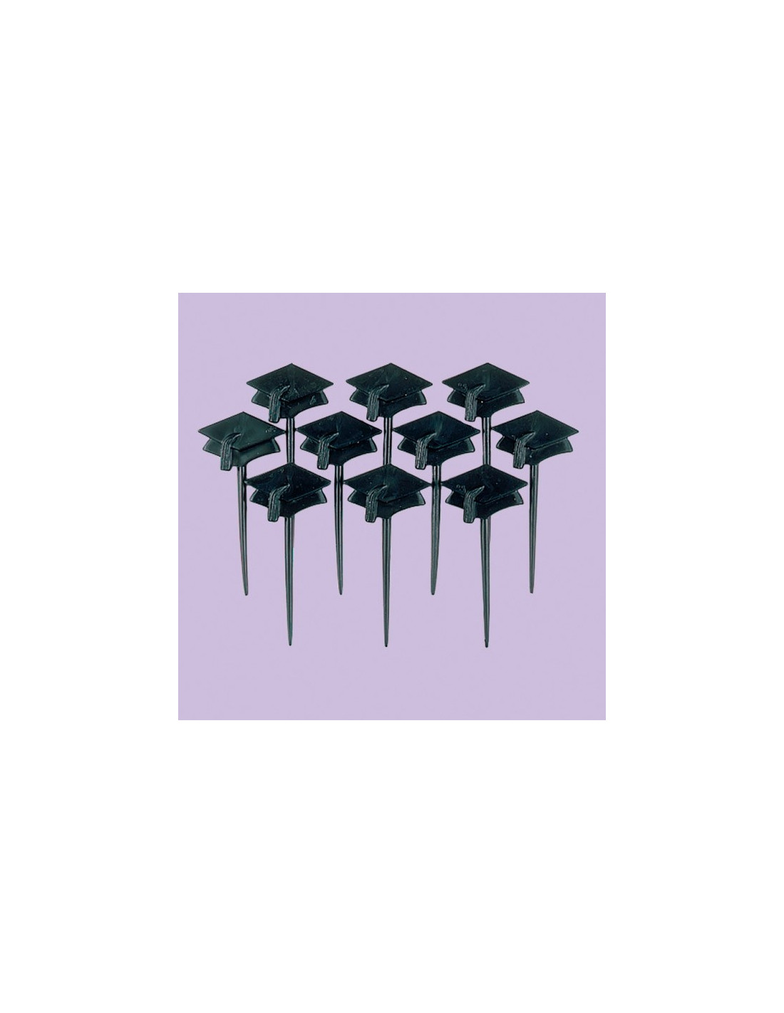 Pinchos pick para graduación que incluye un set de 10 piezas o picks de plástico con forma de birrete y una altura de 7,6cm. No recomendable para niños menores de 8 años.