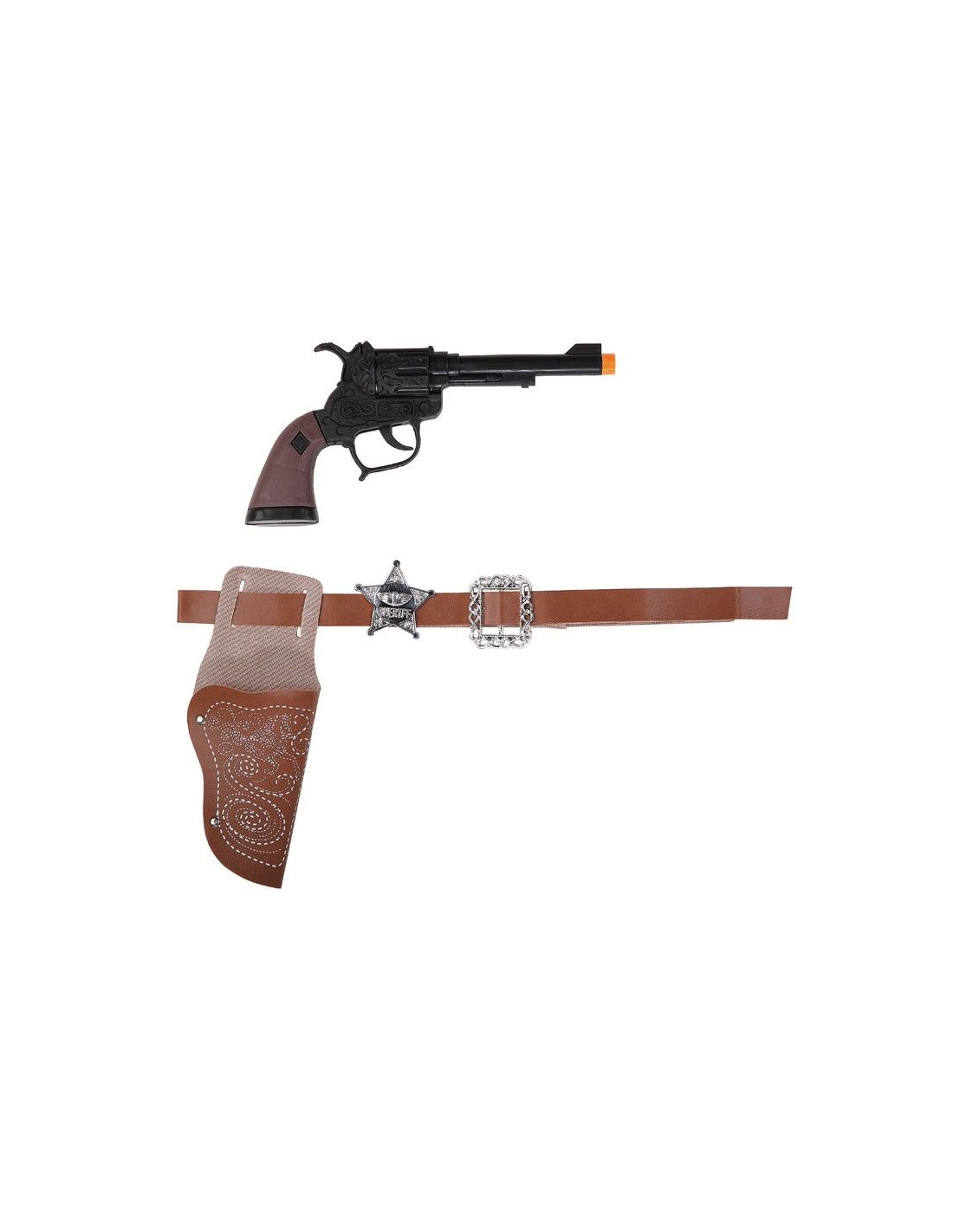 Vive tu mejor fiesta del Farwest y complementa tu disfraz de sheriff con esta cartuchera y pistola de sheriff. el kit incluye cinturón con cartuchera de vaquero, hebilla, pistola de cowboy y placa de sheriff.