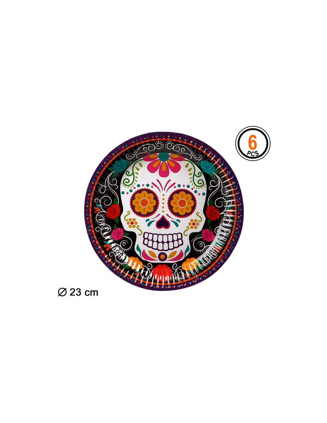 Platos calavera mexicana que contiene 6 platos de cartón de 23cm de diámetro.