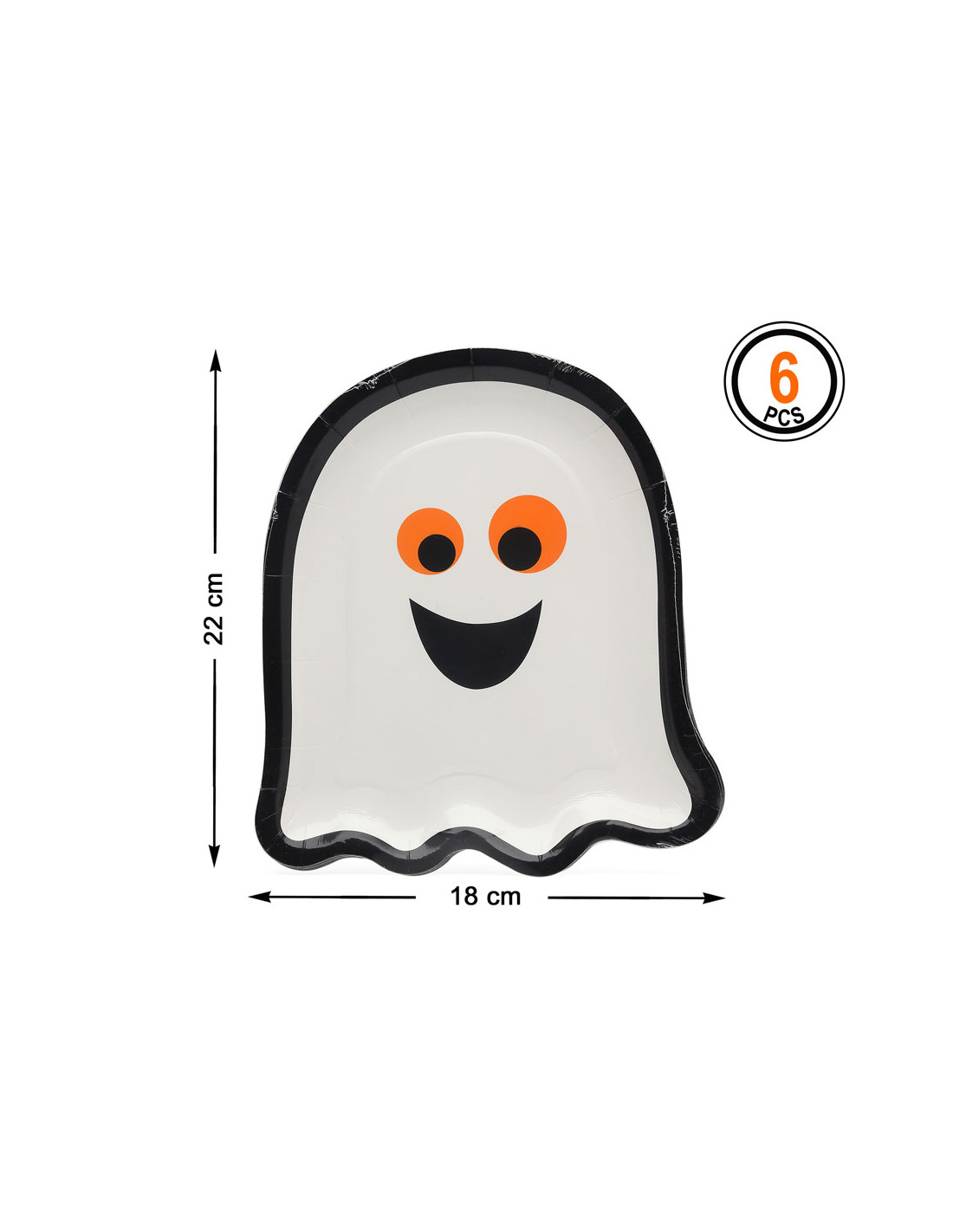 Contiene 6 platos de cartón para Halloween en forma de fantasma. Tienen un tamaño de 22x18cm