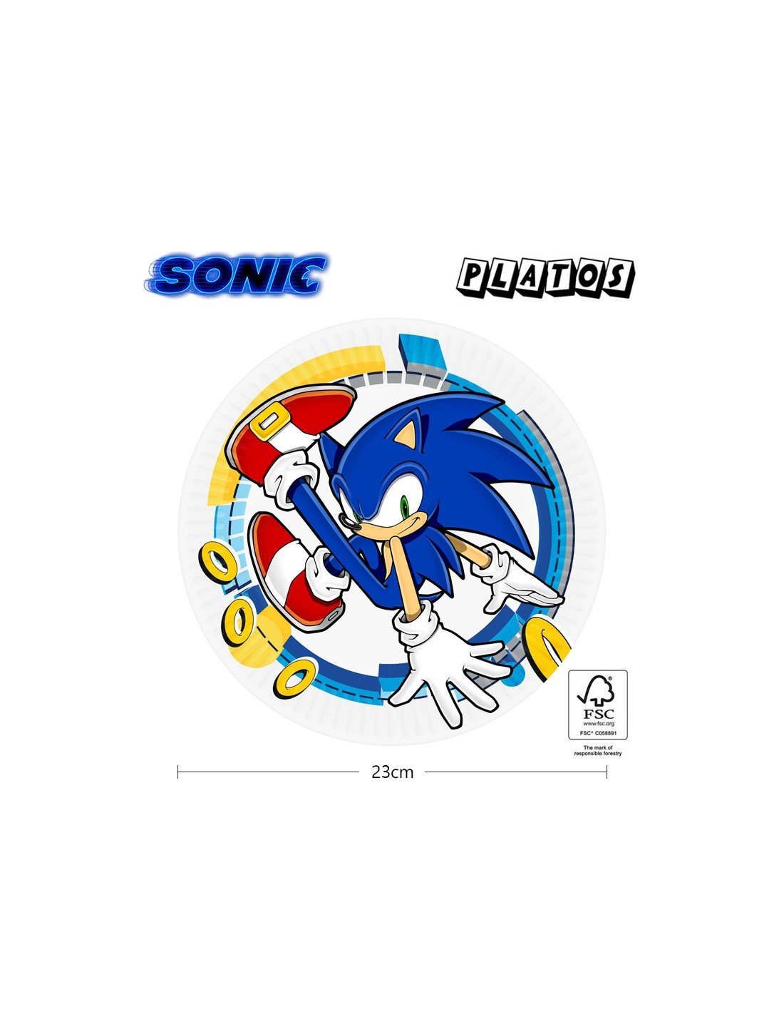 Contiene 8 platos con la imagen de Sonic hechos de cartón y 23cm de diámetro.