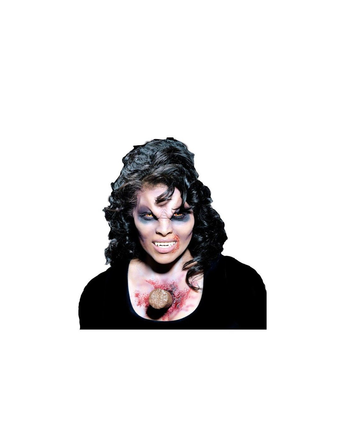 Incluye una tétrica prótesis de látex que simula una estaca que se incrusta en todo el pecho. No olvides completar este kit con un pegamento apropiado y sangre líquida para conseguir este aspecto tan desgarrador.