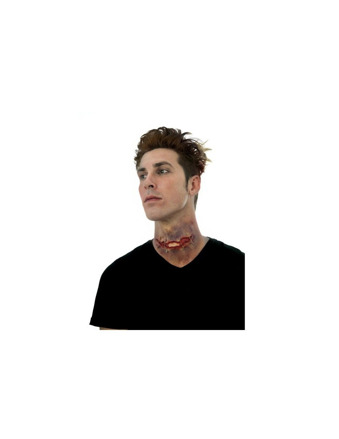 Incluye una escalofriante prótesis de látex de cuello abierto de cuajo, con el tejido desgarrado, y con unos imperdibles que unen la herida. No olvides completar este kit con un pegamento apropiado y sangre líquida para conseguir este aspecto tan desgarrador.