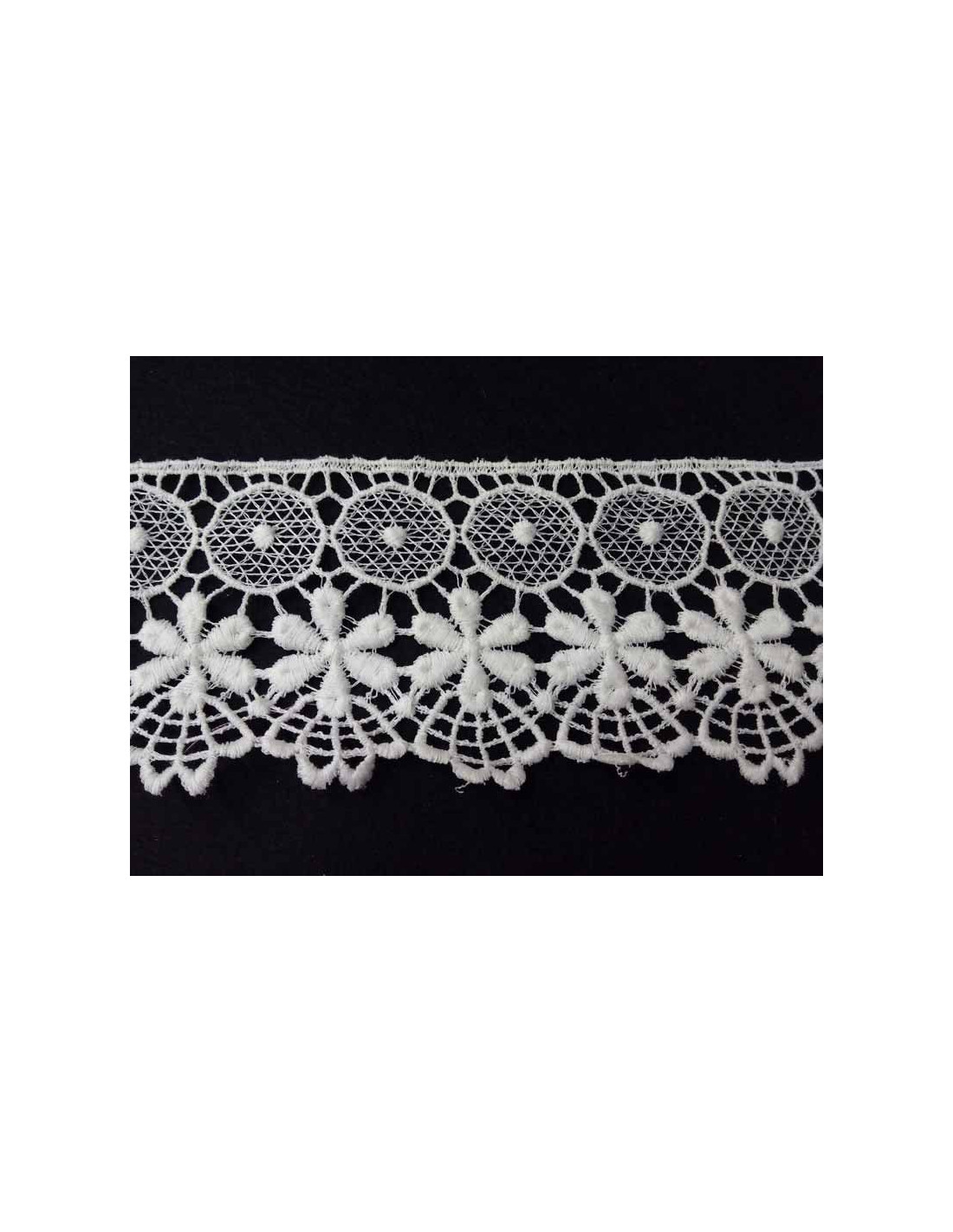 Puntilla blanca de dibujos bordados de 7cm de anchura. Se vende por metros. Unidad minima de compra 1m.