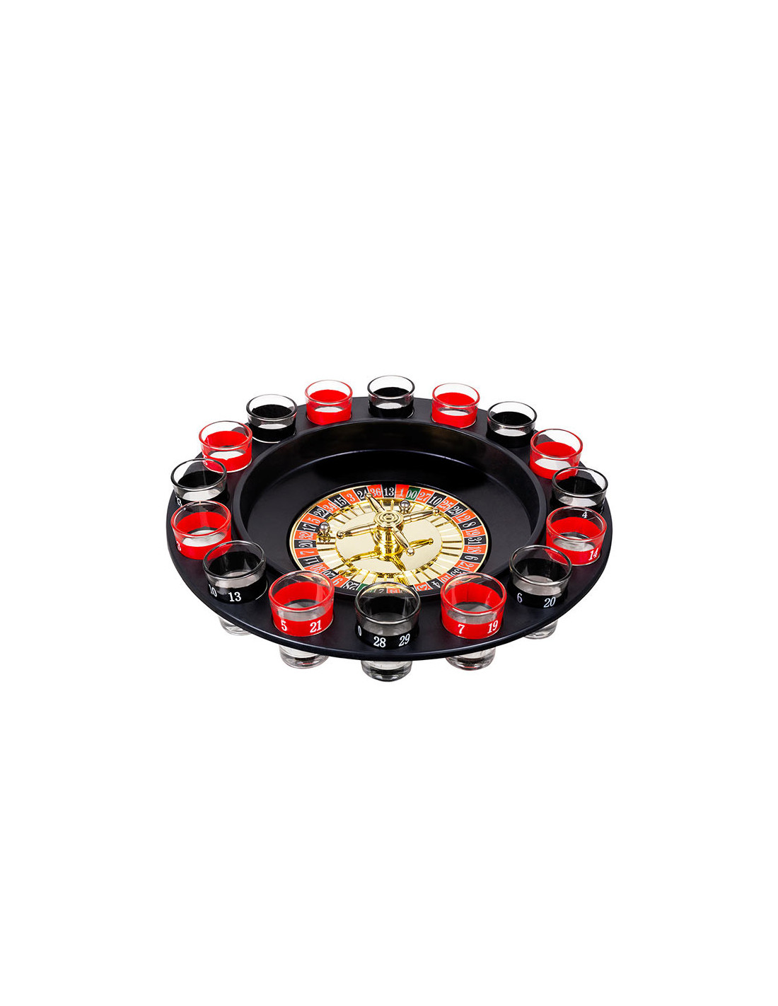 Contiene una ruleta con 40cm de diámetro, 16 vasitos de cristal de chupito y dos bolas.