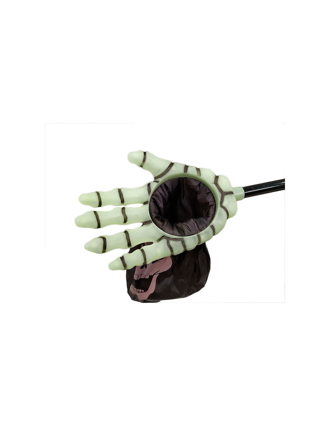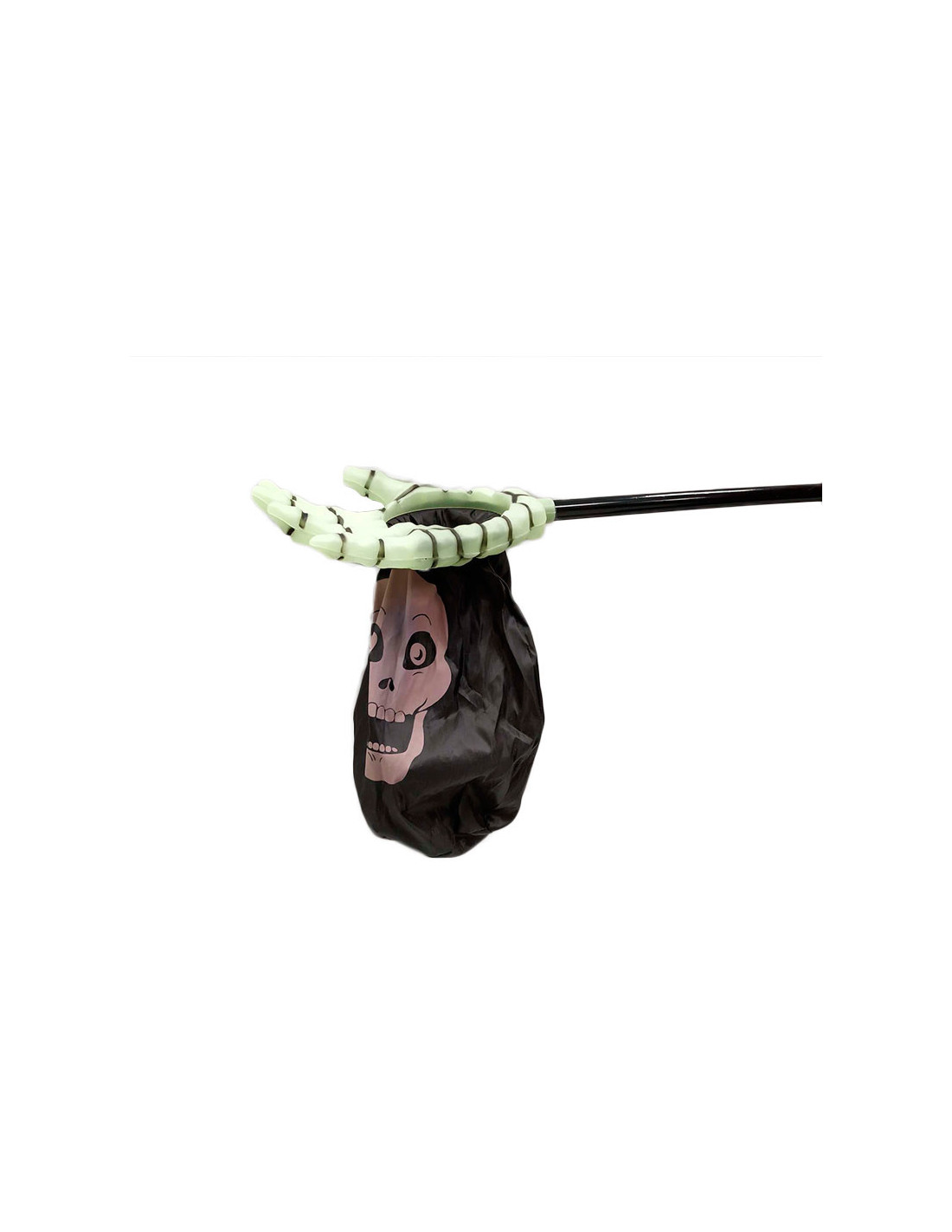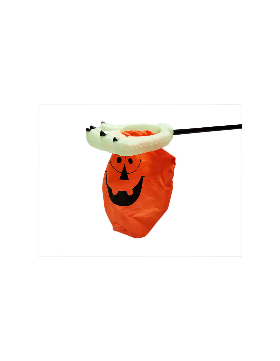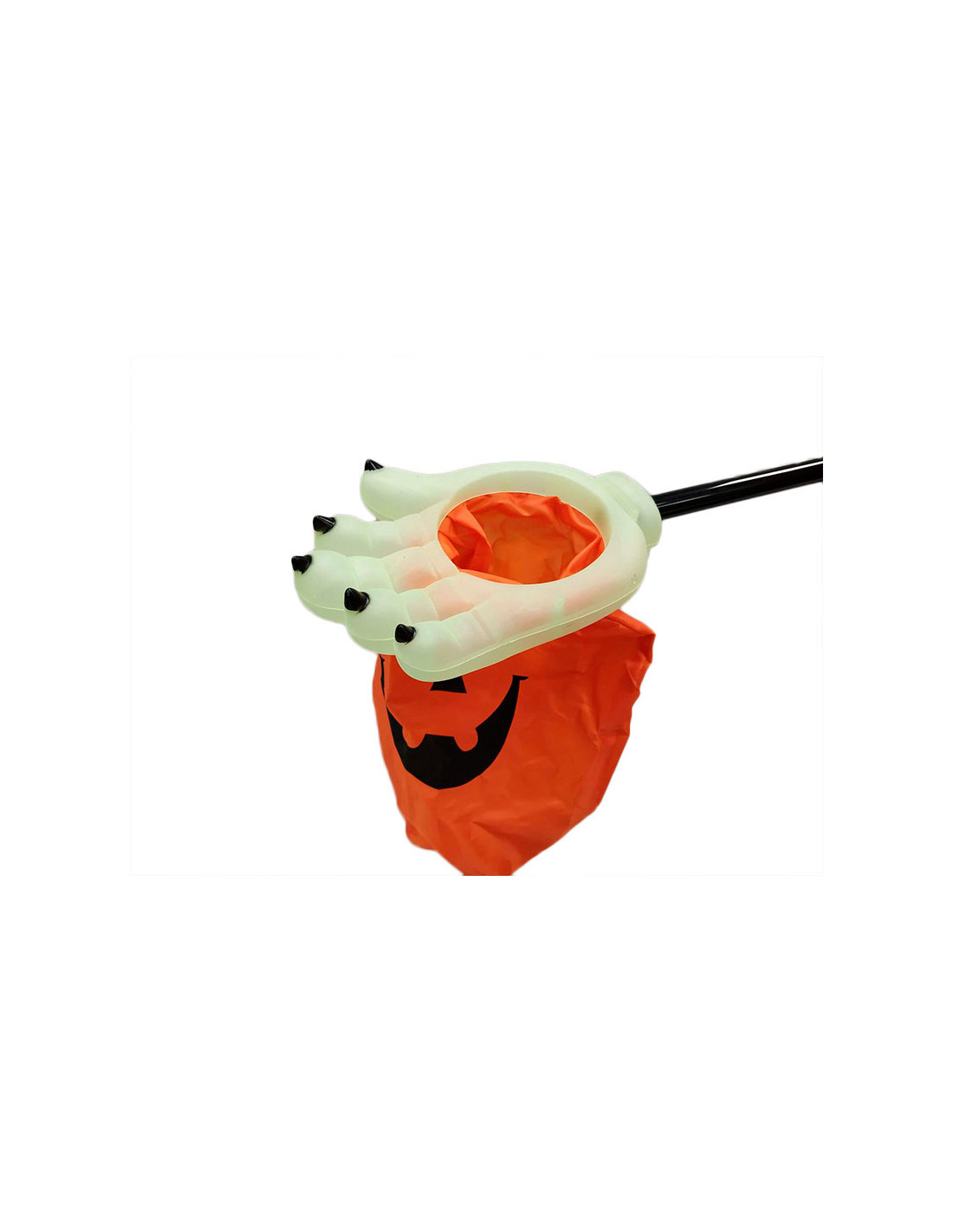 Saco para caramelos Halloween que incluye una mano con un saco para hacer truco o trato.