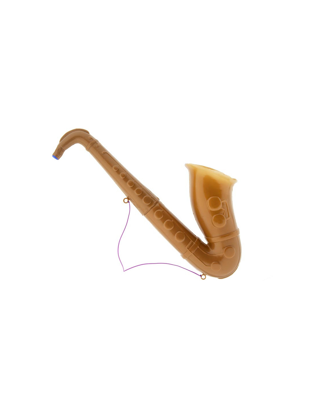 El saxofón mide 48cm de largo, es de plástico y tiene un cordel de plástico para colgar.