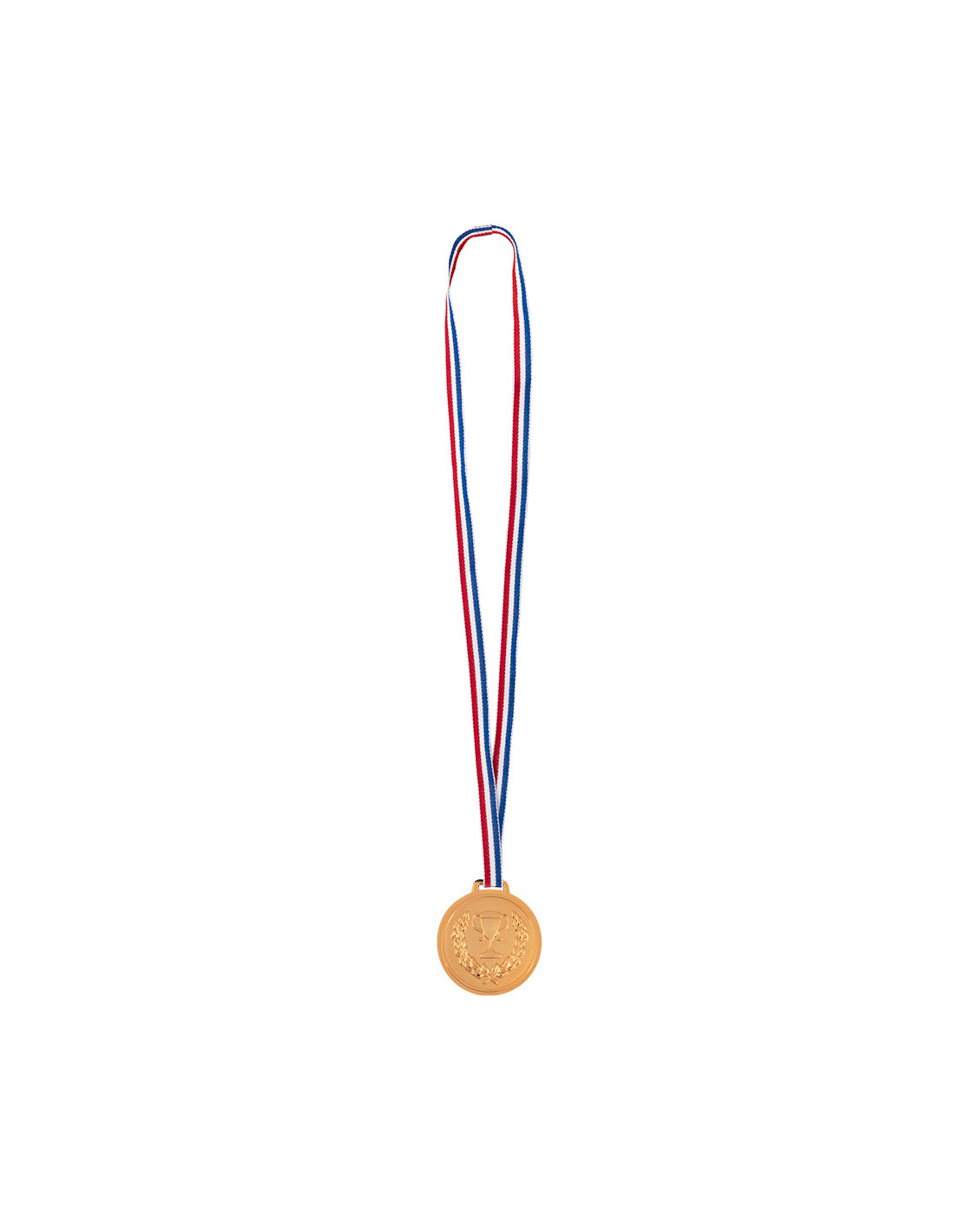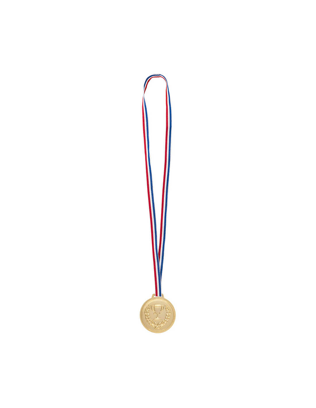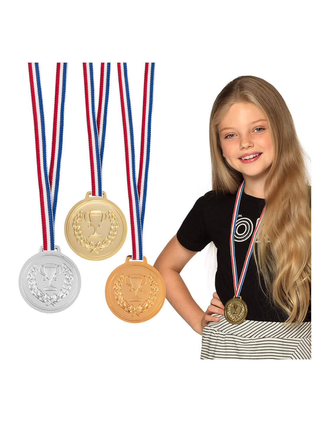 Contiene 3 medallas de plástico, cada una de un color simulando oro, plata y bronce.