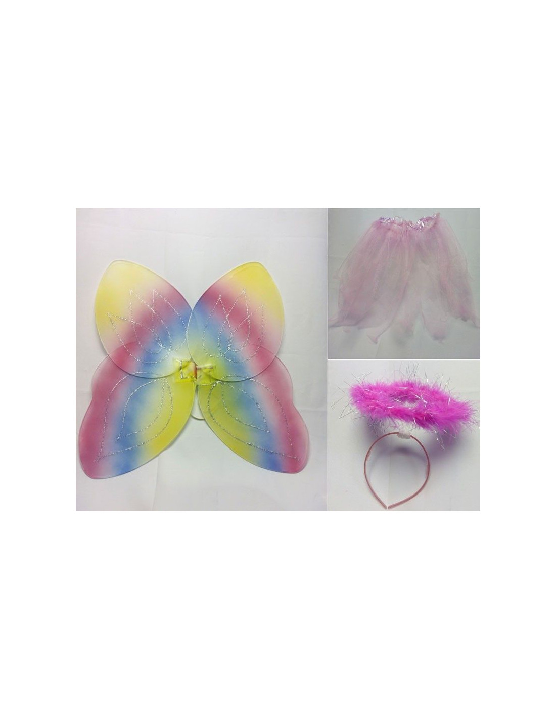 Conviértete en la más colorida y risueña de todos los personajes de fantasía épica con este set de hada multicolor para niña. Incluye un maravilloso set de hada multicolor infantil, compuesto de unas alas con dimensiones de 50x50cm, tutú rosa, y una corona del mismo color.