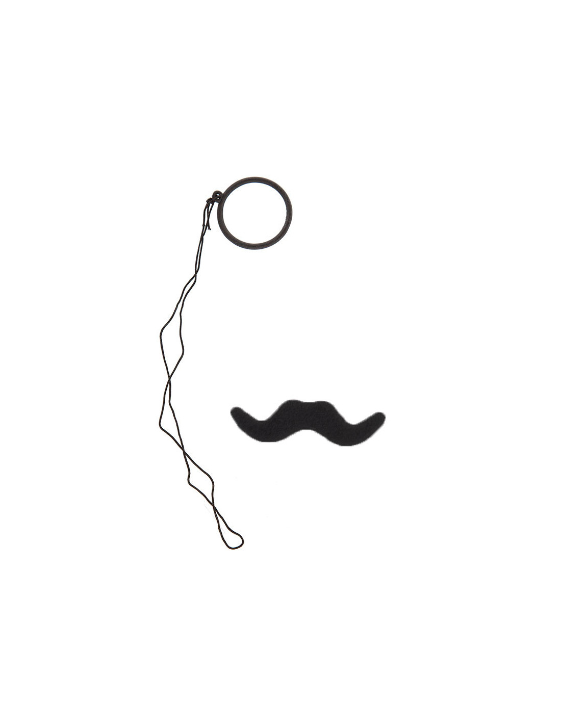 Set bigote y monóculo compuesto por un bigote autoadhesivo y un monóculo negro de plástico.