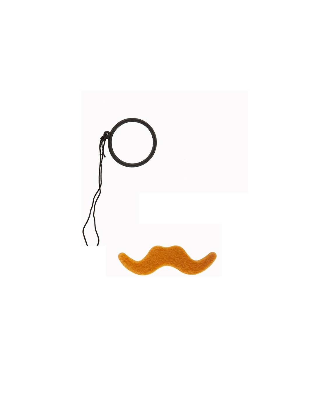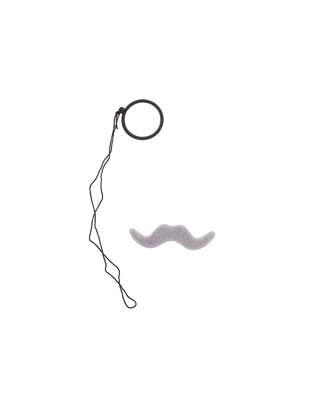 El set consta de un bigote autoadhesivo del color seleccionado y un monóculo negro de plástico con una cuerda.