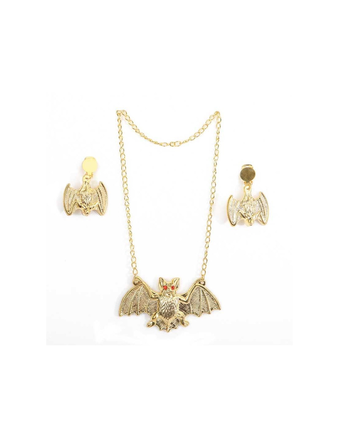 Una elegante y temida vampira serás con este set collar y pendientes murciélago junto a tu disfraz. Deslumbrarás en tu fiesta de Halloween o Carnaval.