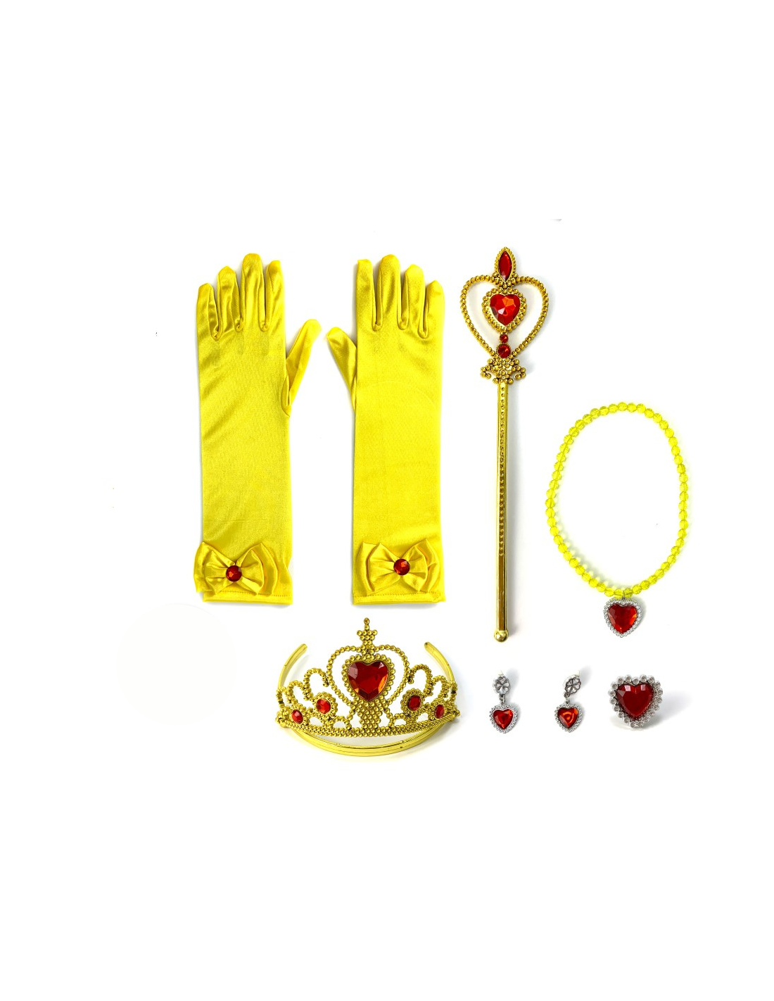 Set complementos princesa Bella que incluye guantes amarillos de 30cm (aproximadamente), varita, diadema, anillo y collar.