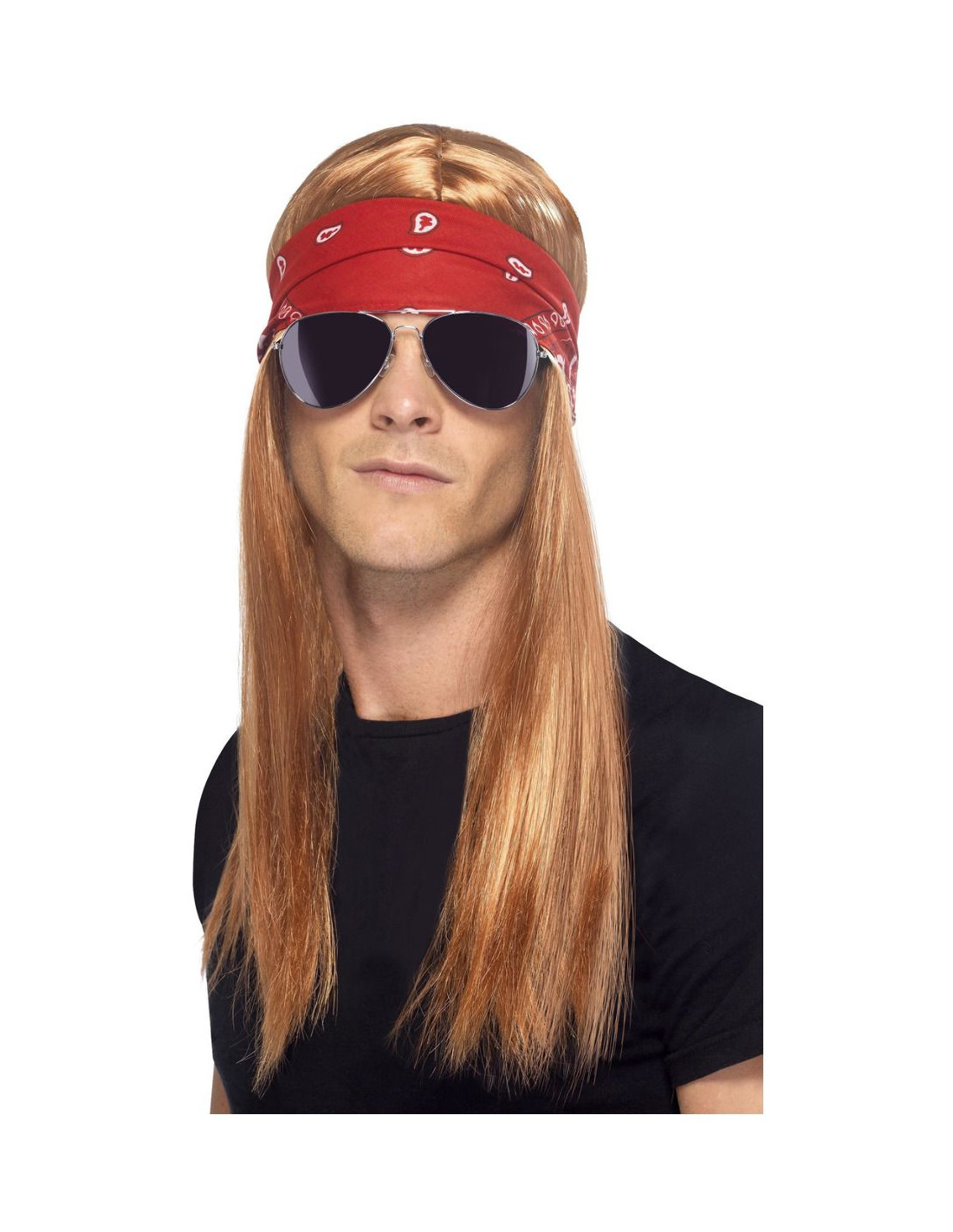 Set complementos rockero de los 90 que incluye peluca castaña rojiza con pañuelo y gafas de sol.