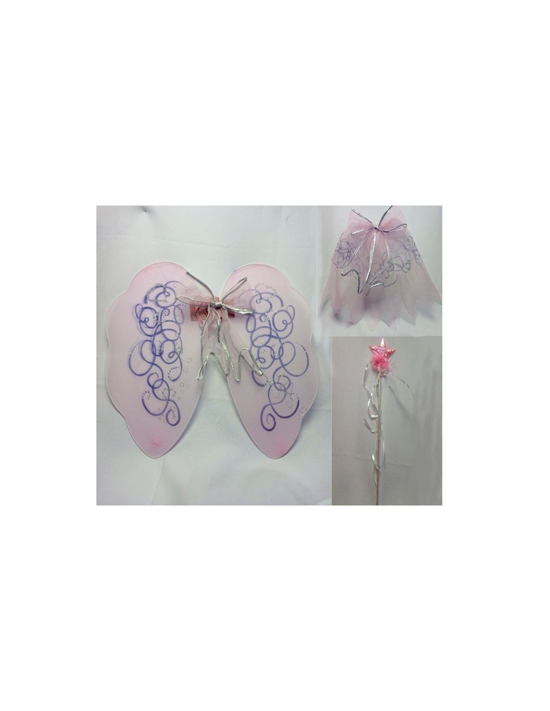 Set que incluye alas rosas de 50x50cm, tutú con lacito y varita mágica.