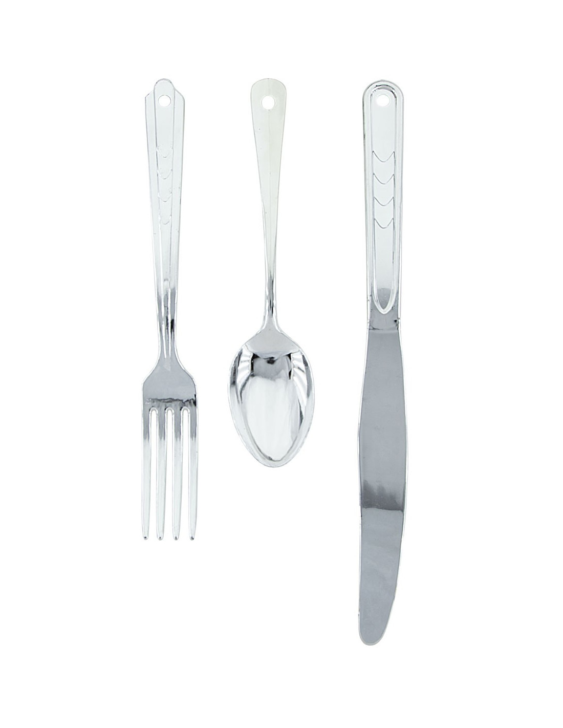 Este set de cubiertos incluye tres piezas de plástico color plata metalizados; tenedor, cuchara y cuchillo. Cada pieza mide aproximadamente 30cm de alto.
