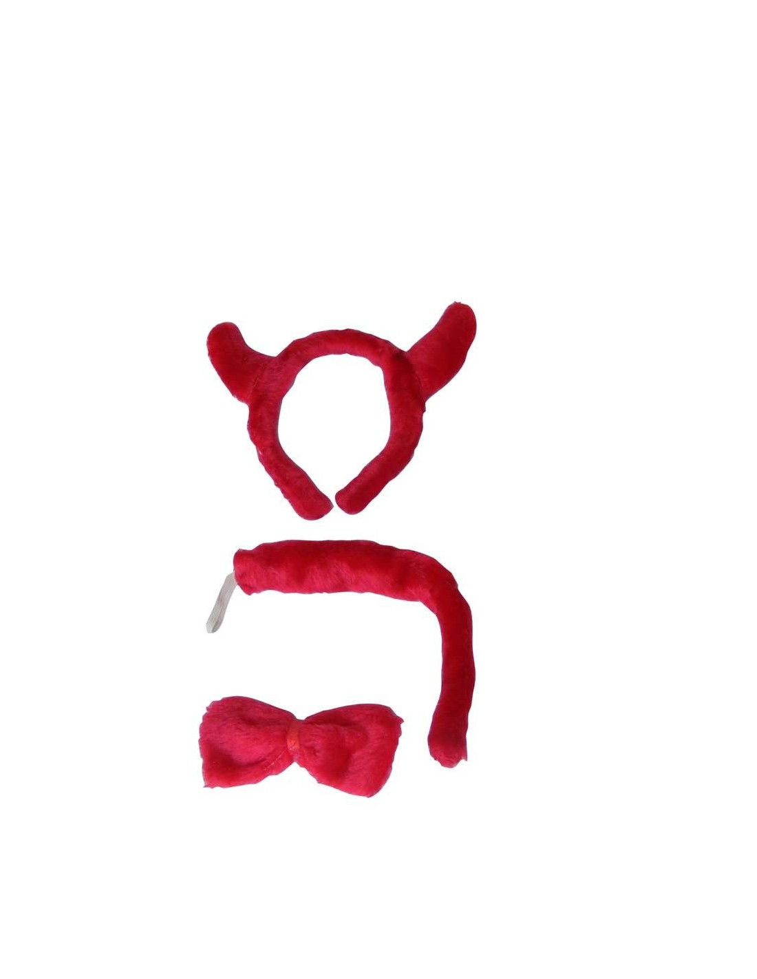 Complementa tu disfraz de demonio o diablesa con este set de diablo. Fabricado en tejido de dacha en color rojo. Incluye un set de diablo para adulto o infantil, con una diadema de cuernos, pajarita, y cola con elástico para darle el toque perfecto a tu personaje del averno.