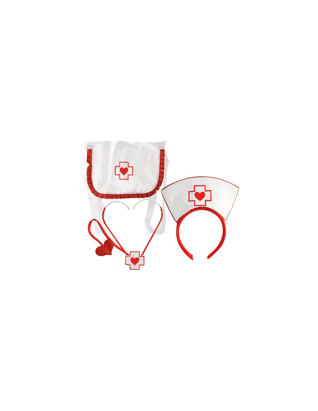 Set de enfermera que incluye diadema con cofia, delantal y fonendoscopio de corazón.