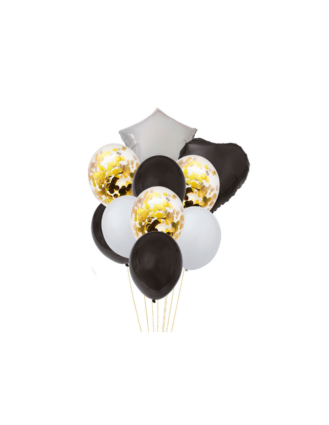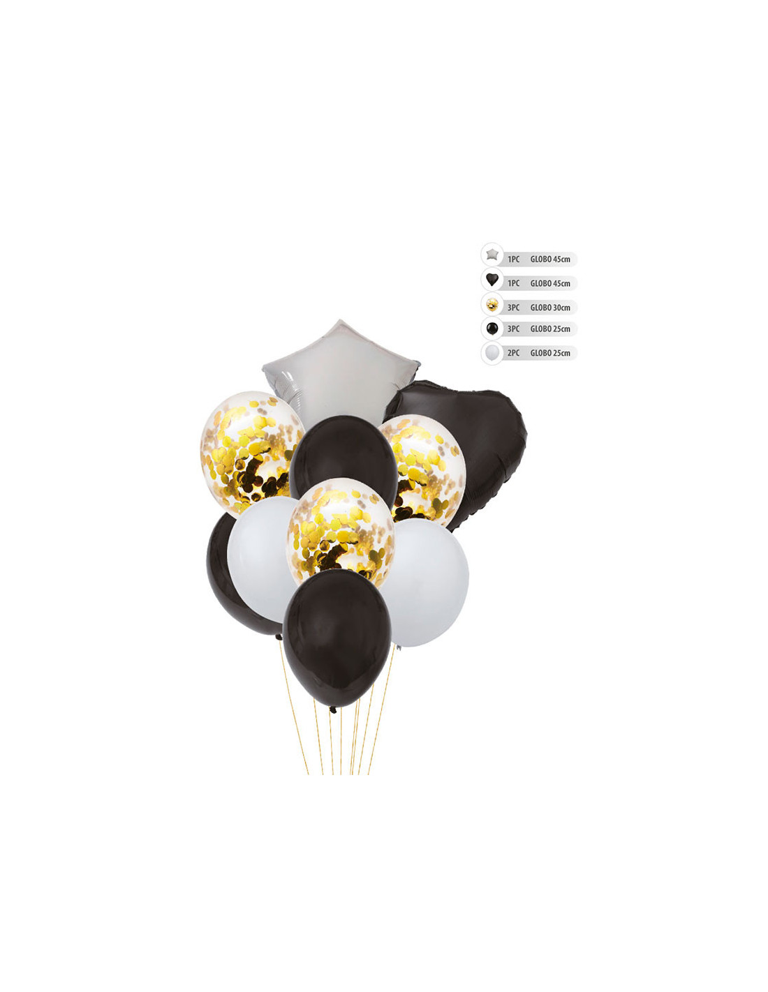 El set de globos Star que contiene 1 globo plata con forma de estrella de 45cm, 1 globo negro con forma de corazón de 45cm, 3 globos de látex transparentes de 30cm rellenos de confetti dorados, 3 globos negros de látex de 25cm y 2 globos de látex blancos de 25cm.