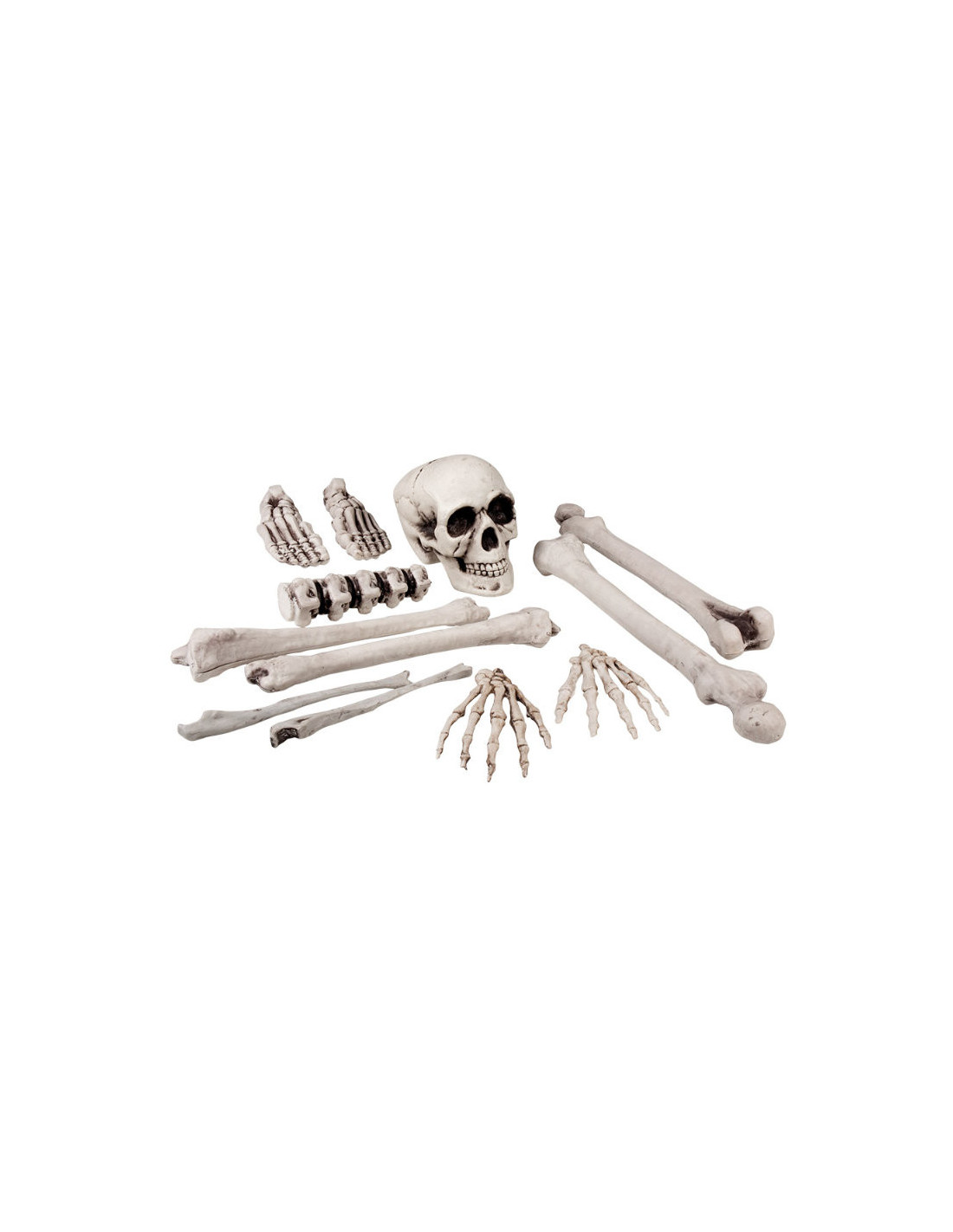 Incluye una calavera de 10x9cm, dos pies de 12,5x4,5cm, vértebra con 9cm de alto, dos manos de 10cm alto cada una y huesos surtidos en distintos tamaños. Los más largos miden 22cm aproximadamente.
