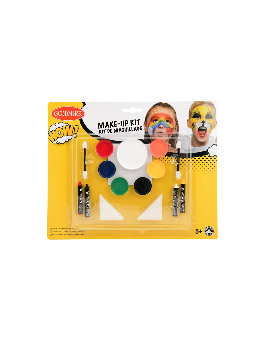 Set maquillaje infantil que incluye una tarrina blanca, 6 tarrinas más pequeñas de rojo, azul, verde, negro, amarillo, naranja; 4 barritas de color rojo, negro, blanco y amarillo; 2 aplicadores y dos esponjas. El maquillaje incluido es graso.