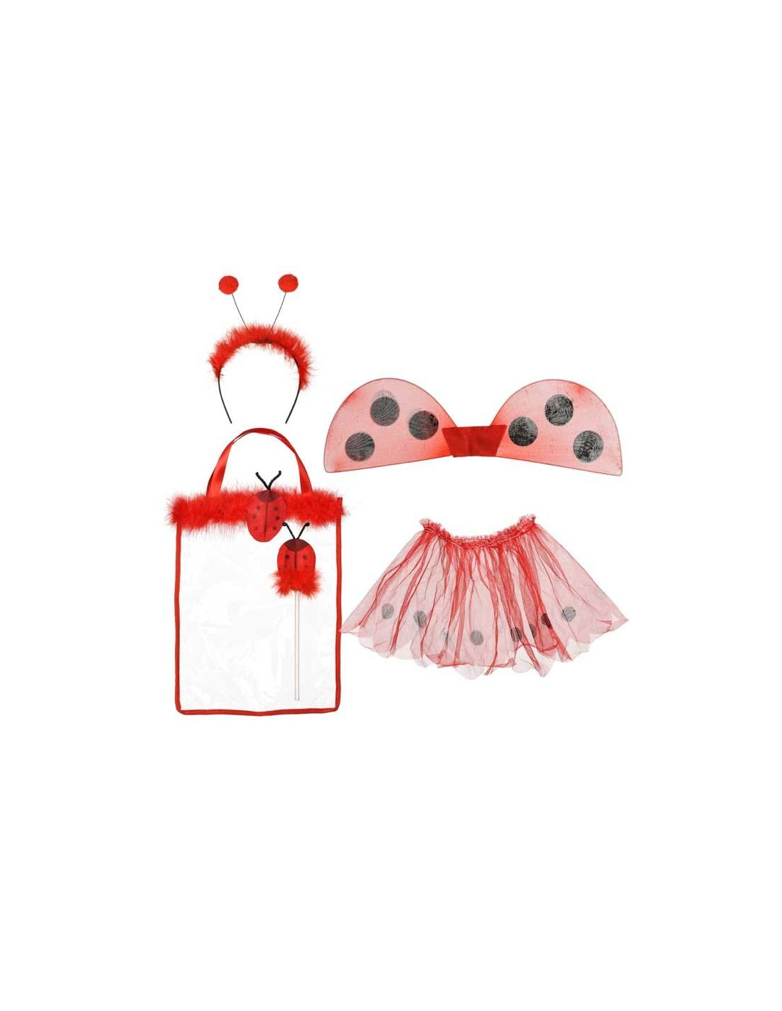 Conjunto de alas y falda de tela junto con una corona y varita todo decorado con colores caracterizando una mariquita. Tambien incluye una bolsa de plastico blando con plumas de marabu