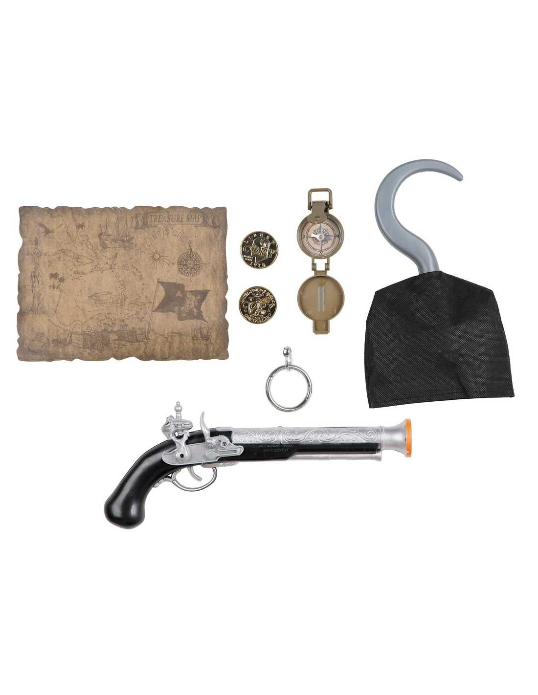 Complementa tu disfraz de corsario infantil con este set de pirata con pistola para niño. Fabricados en plástico de pvc. Incluye un magnífico set de pirata para niño con un trabuco, monedas, brújula pirata, pendiente, garfio y lo más importante, los planos del tesoro perdido. Tamaño infantil (dimensiones de 30cm de longitud).