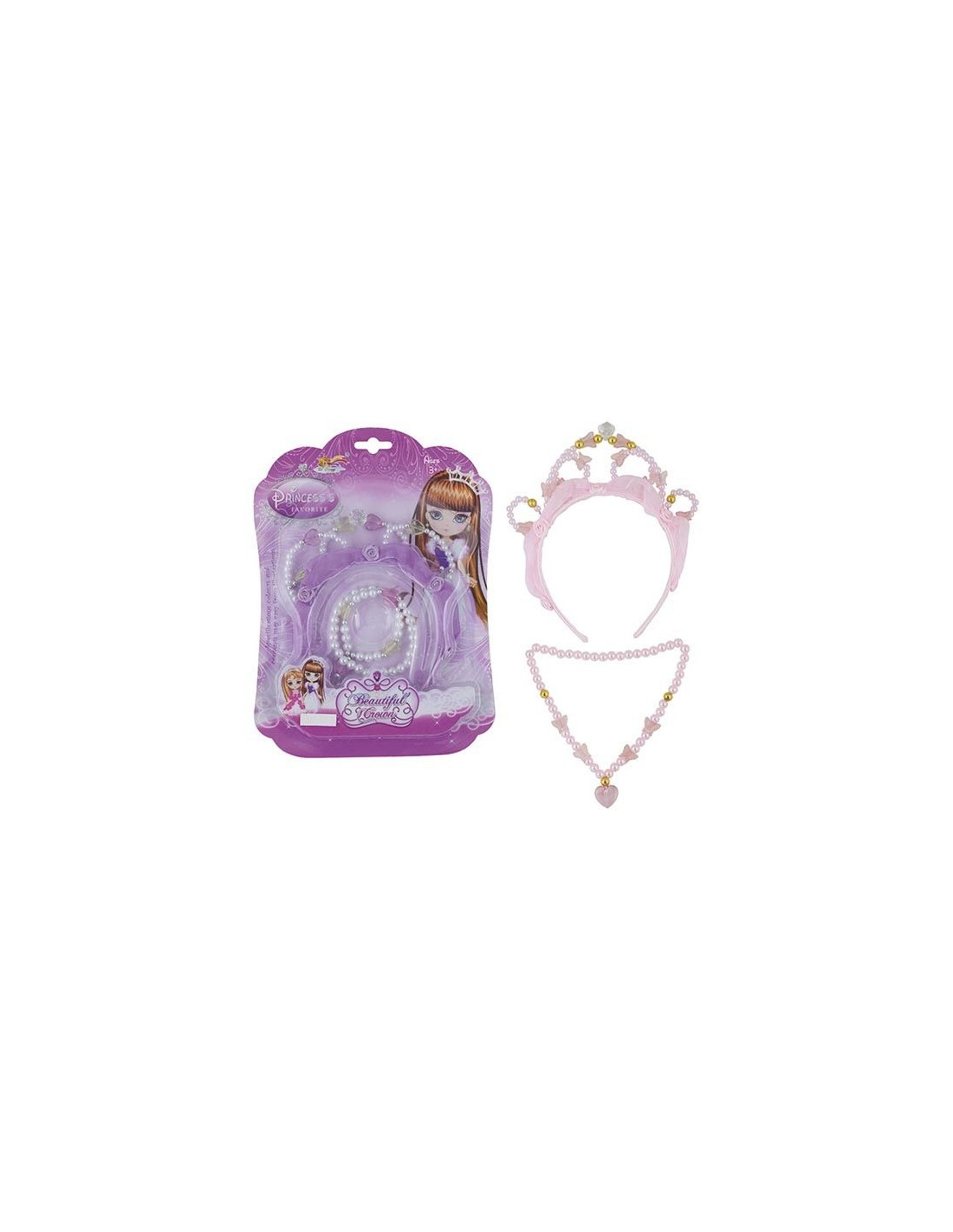 Set de princesa para complementar el disfraz de princesita de tu pequeña. Incluye diadema con corona y collar disponibles en color rosa y morado. Están decoradas con perlas y mariposas o corazones.