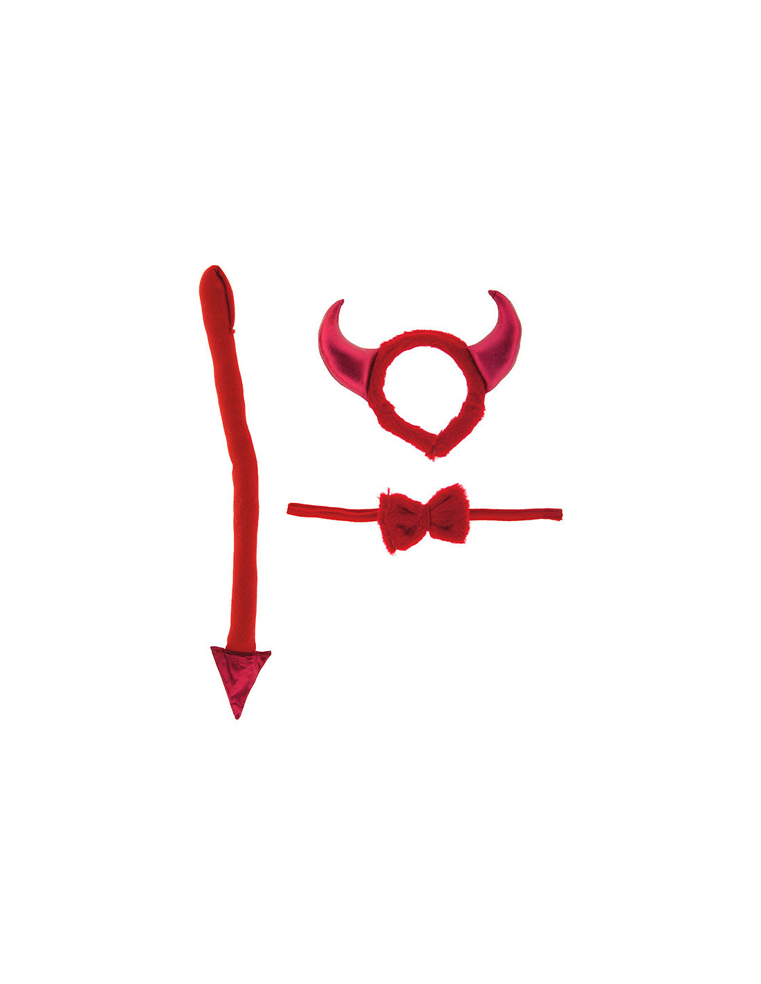 Este set de diablesa está formado por una diadema de pelo con cuernos, pajarita de pelo con velcro y cola.