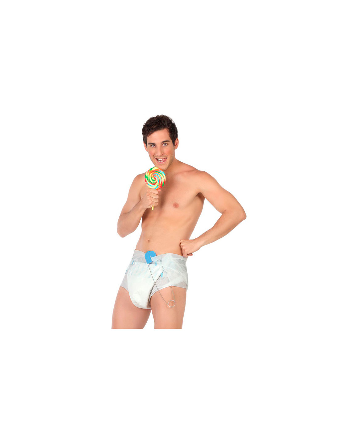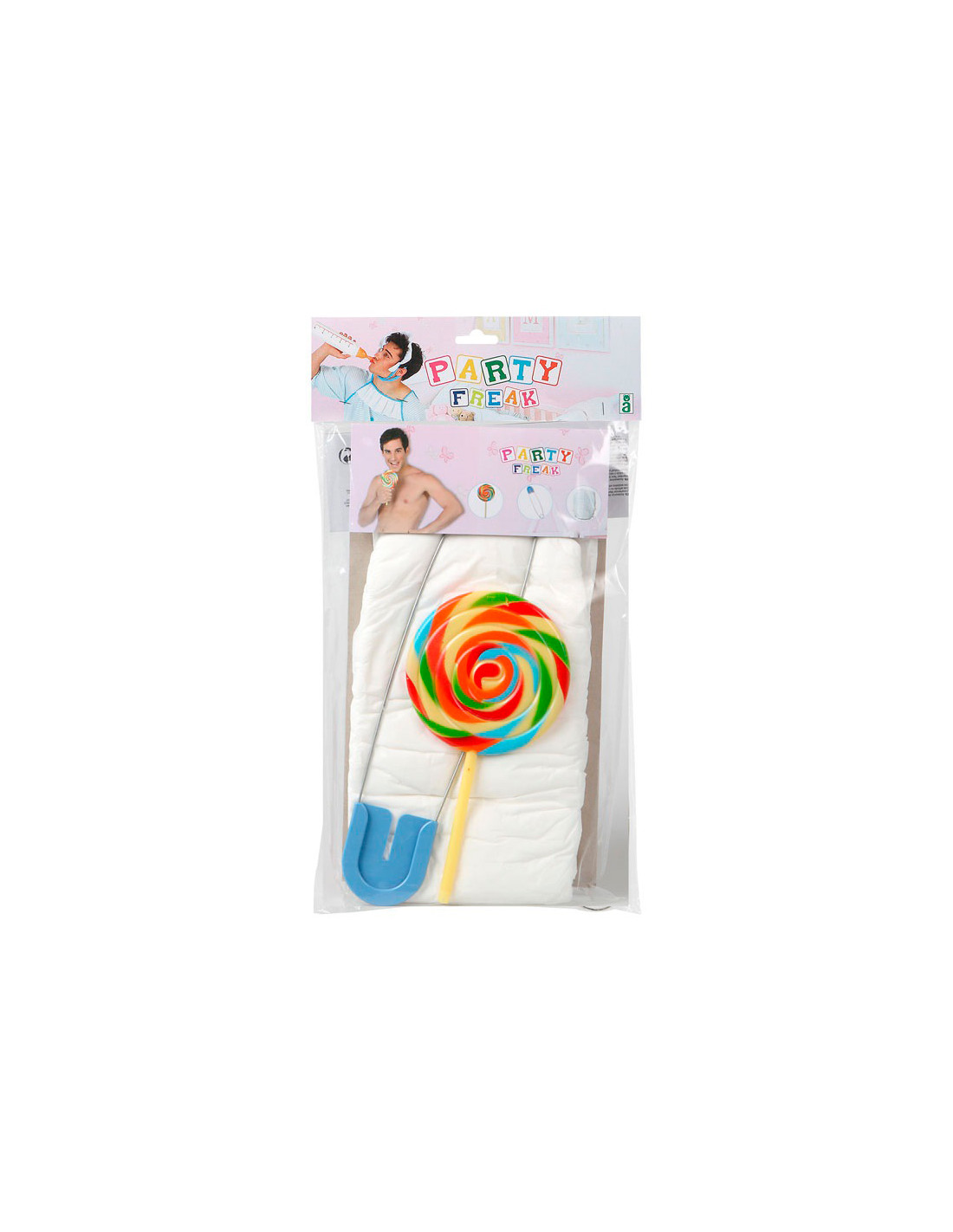 Set disfraz de bebé para adulto que incluye pañal adulto, imperdible gigante y caramelo.