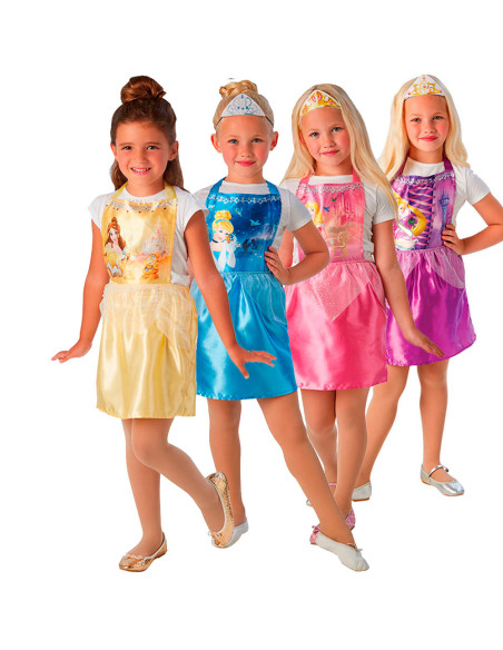 Set disfraz princesa Disney económico para regalar a las pequeñas en cumpleaños o navidad. La magia inundará sus juegos con este sencillo disfraz a modo de delantal de su princesa favorita.