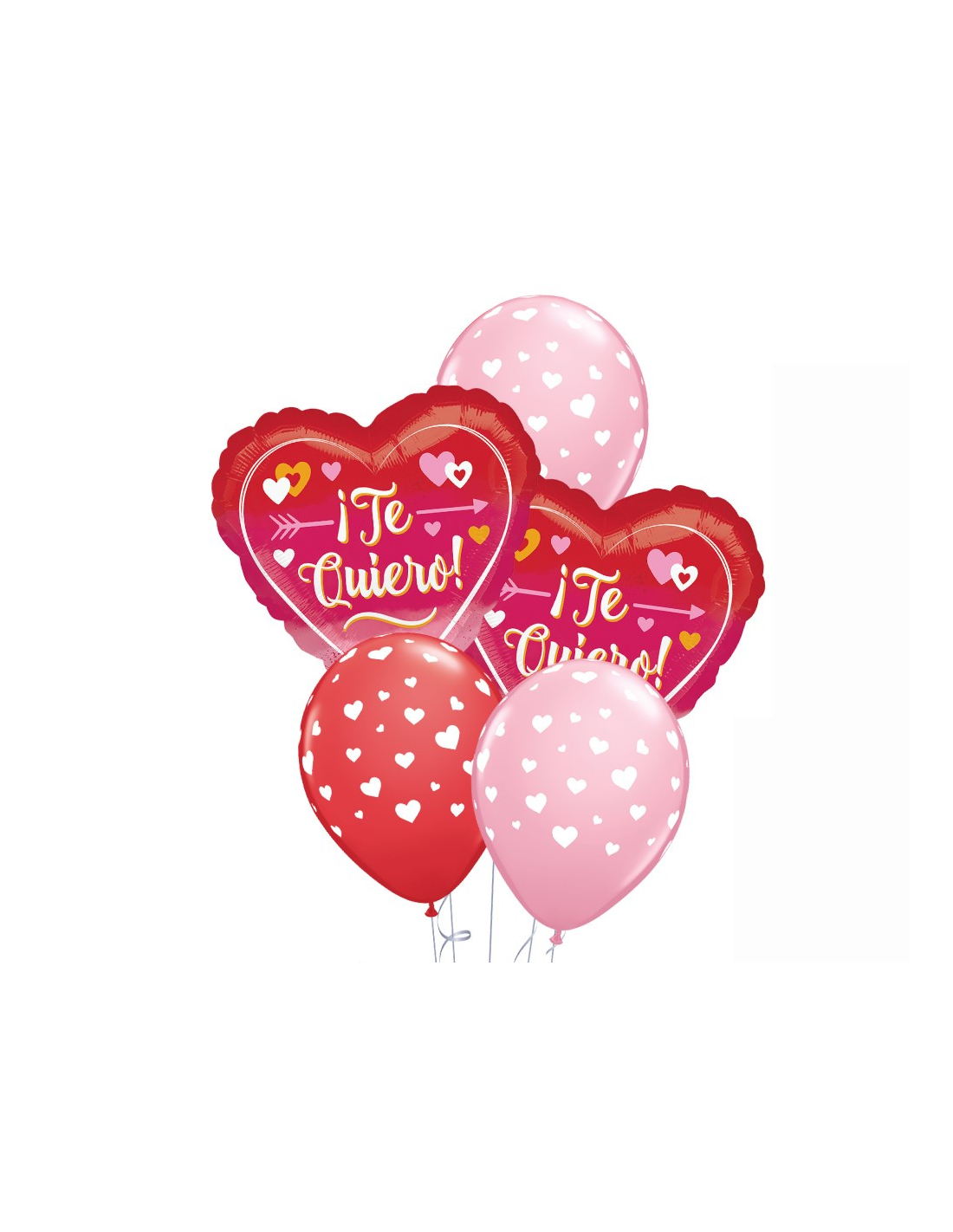 Incluye dos globos con forma de corazón "Te quiero" de 45cm, un globo rojo estampado de 30cm y dos globos rosas estampado de 30cm.