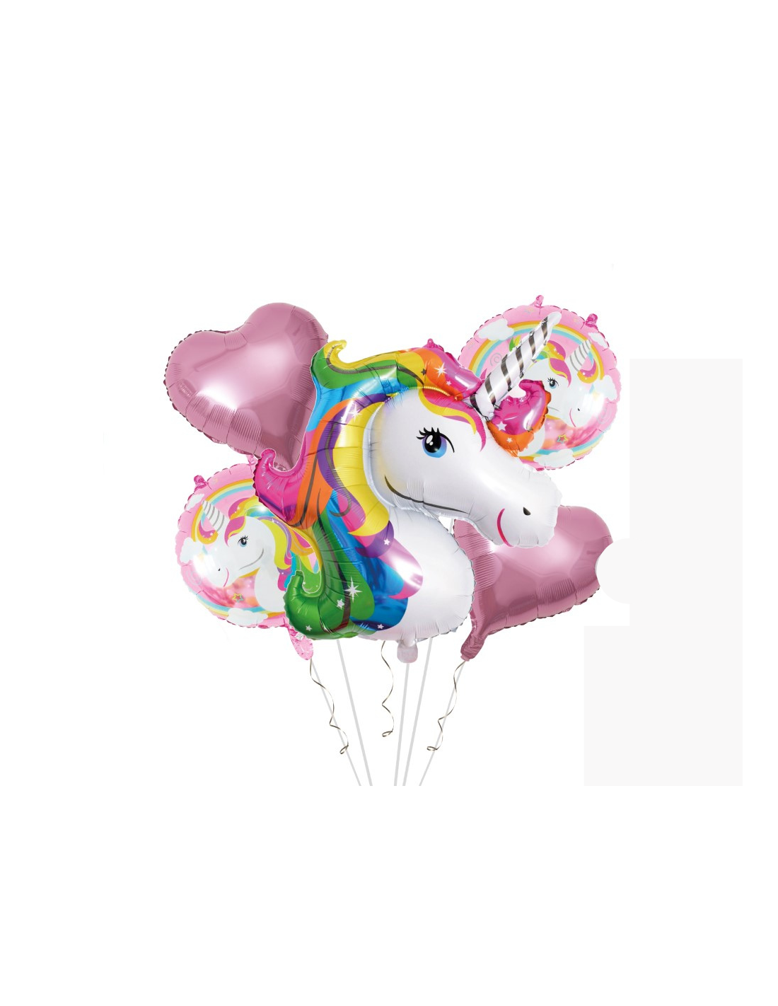 Este bonito pack incluye un globo con forma de unicornio de 100cm, dos globos con forma de corazón de 45cm y dos globos redondos con dibujos de unicornio de 45cm.