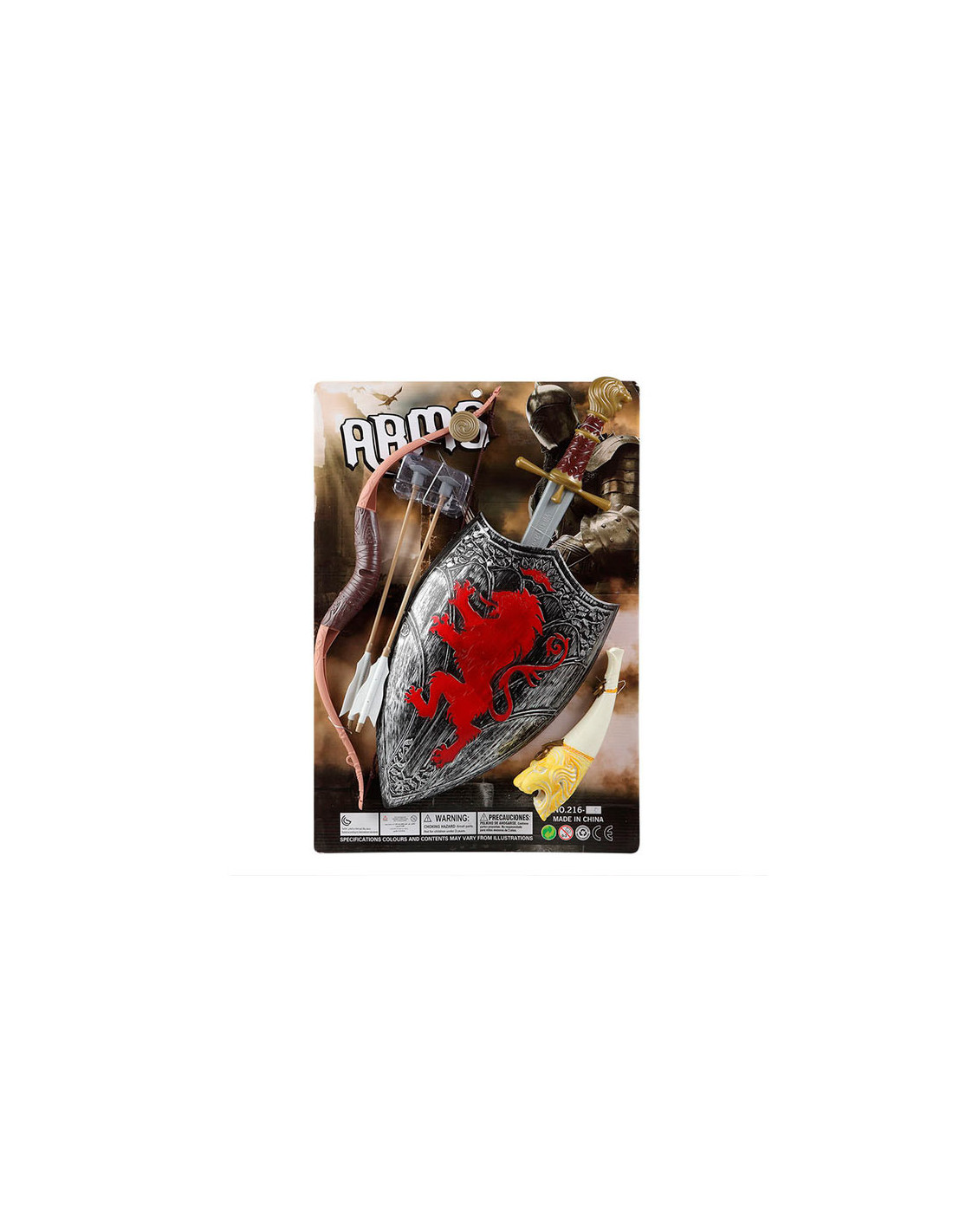 El set guerrero Medieval consta de una espada de 62cm, escudo efecto envejecido con león rojo, arco con dos flechas y corneta. Todo ello de plástico.
