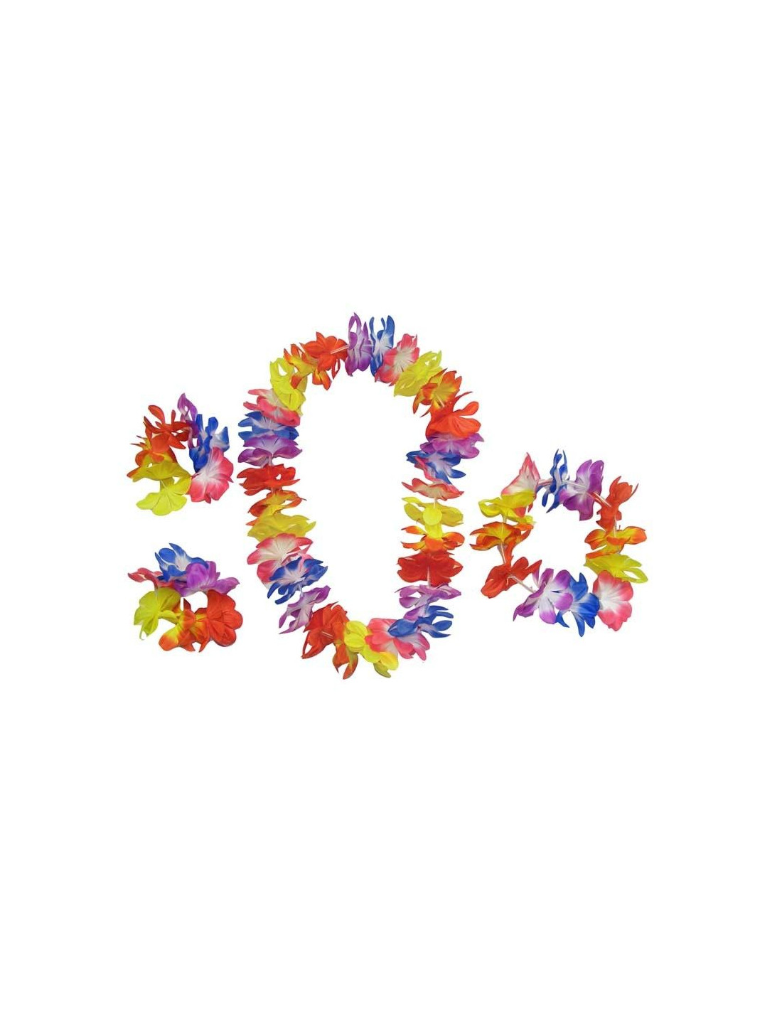 Complementa tu disfraz de hawaiano con este set de hawaiano. Incluye un fantástico set hawaiano, compuesto por un collar de flores fabricadas en tela, un par de pulseras, y cinta para la cabeza.