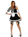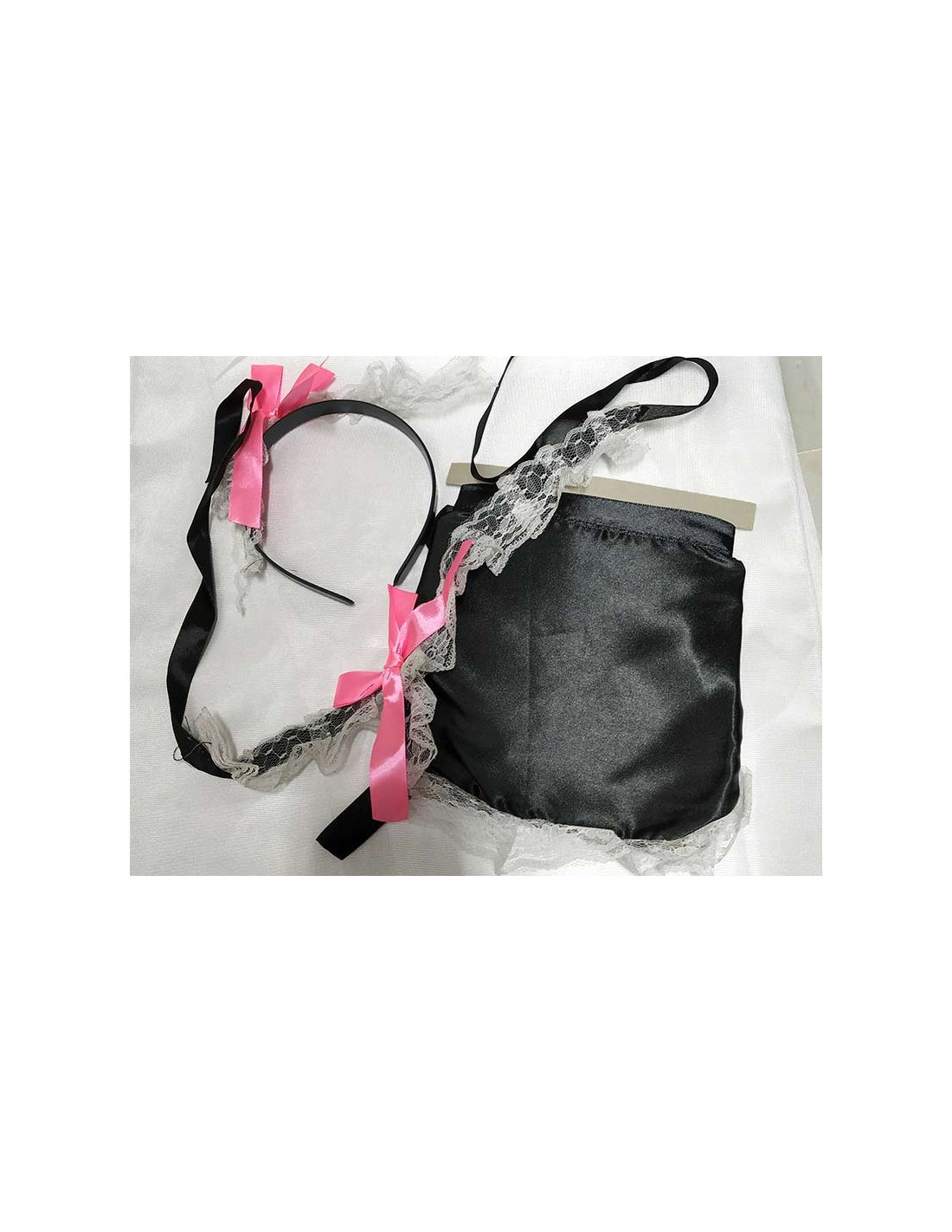 El set limpiadora sexy rosa contiene un delantal negro de raso con puntilla blanca y lazos para atar, una diadema de cofia decorada con un lazo rosa, puntilla alrededor y un lazo para el cuello de raso negro con un lacito rosa y puntilla blanca.