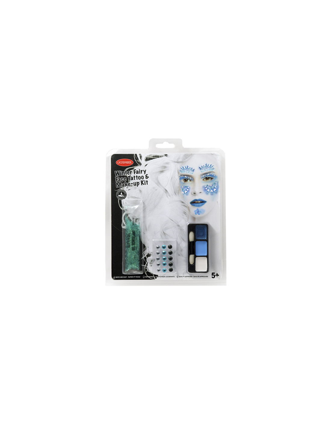 Este completoset contiene una bolista de 7ml de glitter azul en gel, 15 gemas adhesivas, un aplicar con doble punta y 3 colores de maquillaje graso de 1 gramo: azul oscuro, azul claro y blanco