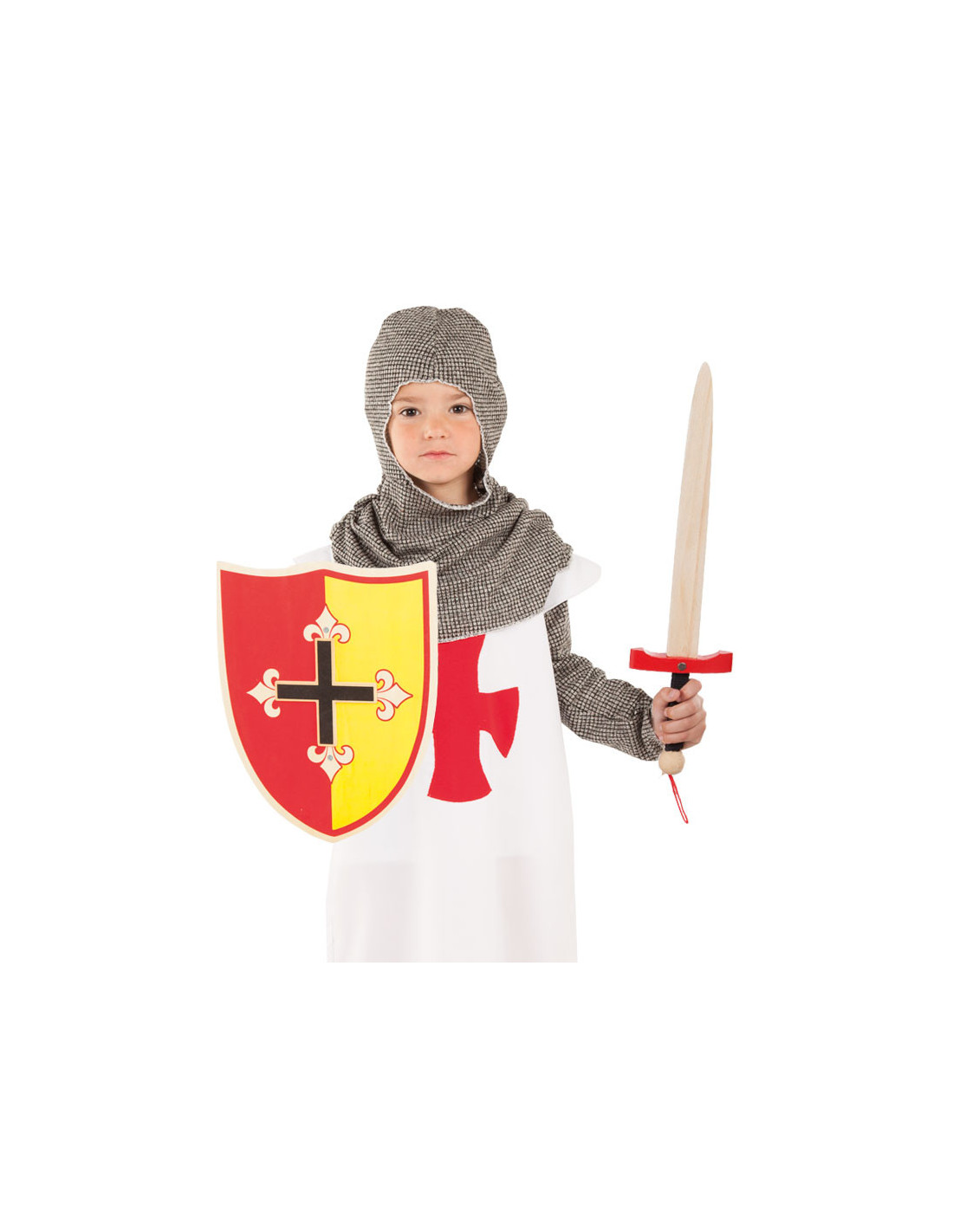 El set medieval de madera contiene una espada que mide 53cm de largo con una funda y un escudo amarillo y rojo con cruz de 30x35cm.
