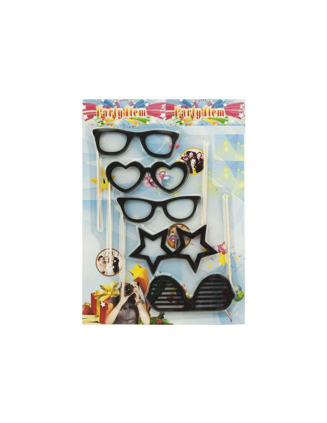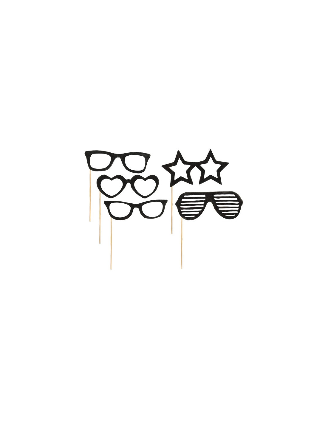 El set photocall gafas incluye 5 antifaces con forma de gafas en distintos modelos hechos de goma eva negra con purpurina y con un palo de madera para sujetar.