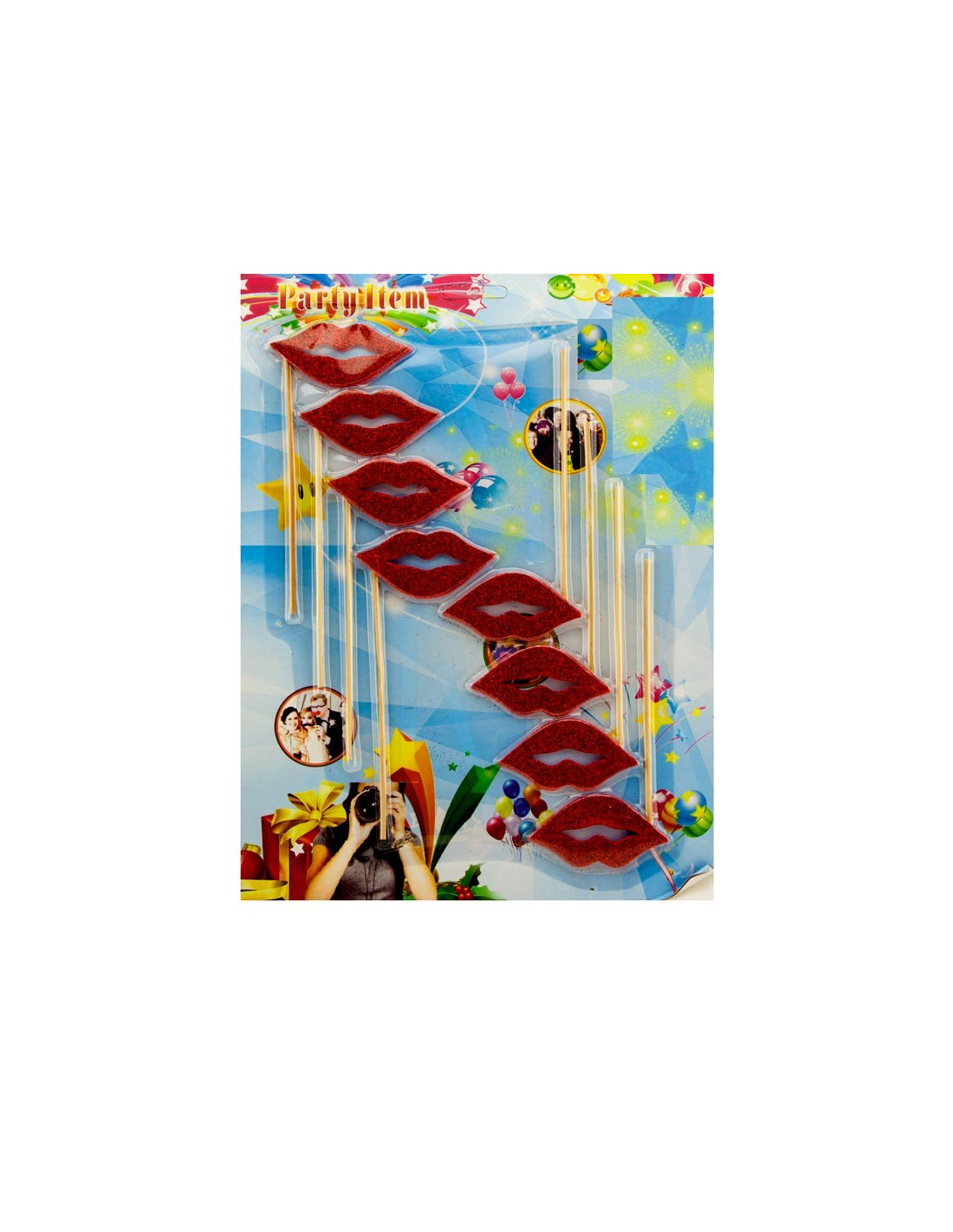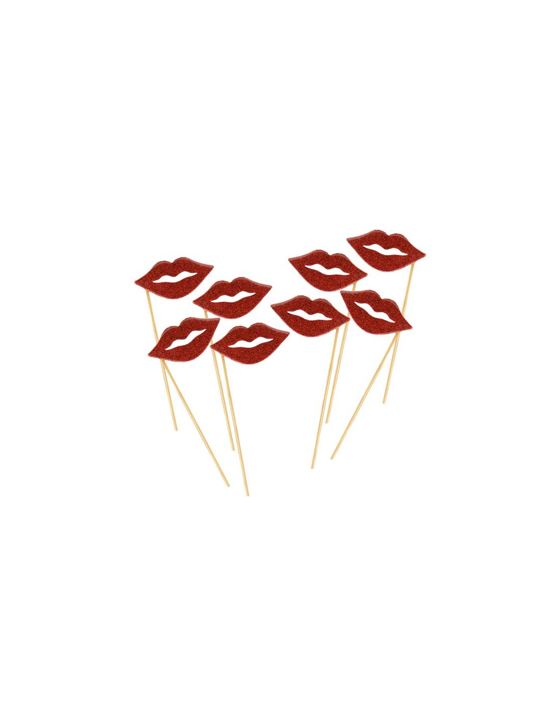 Incluye set photocall labios que incluyen 8 labios de goma eva rojos con purpurina y unos palos de madera para sujetarlos.