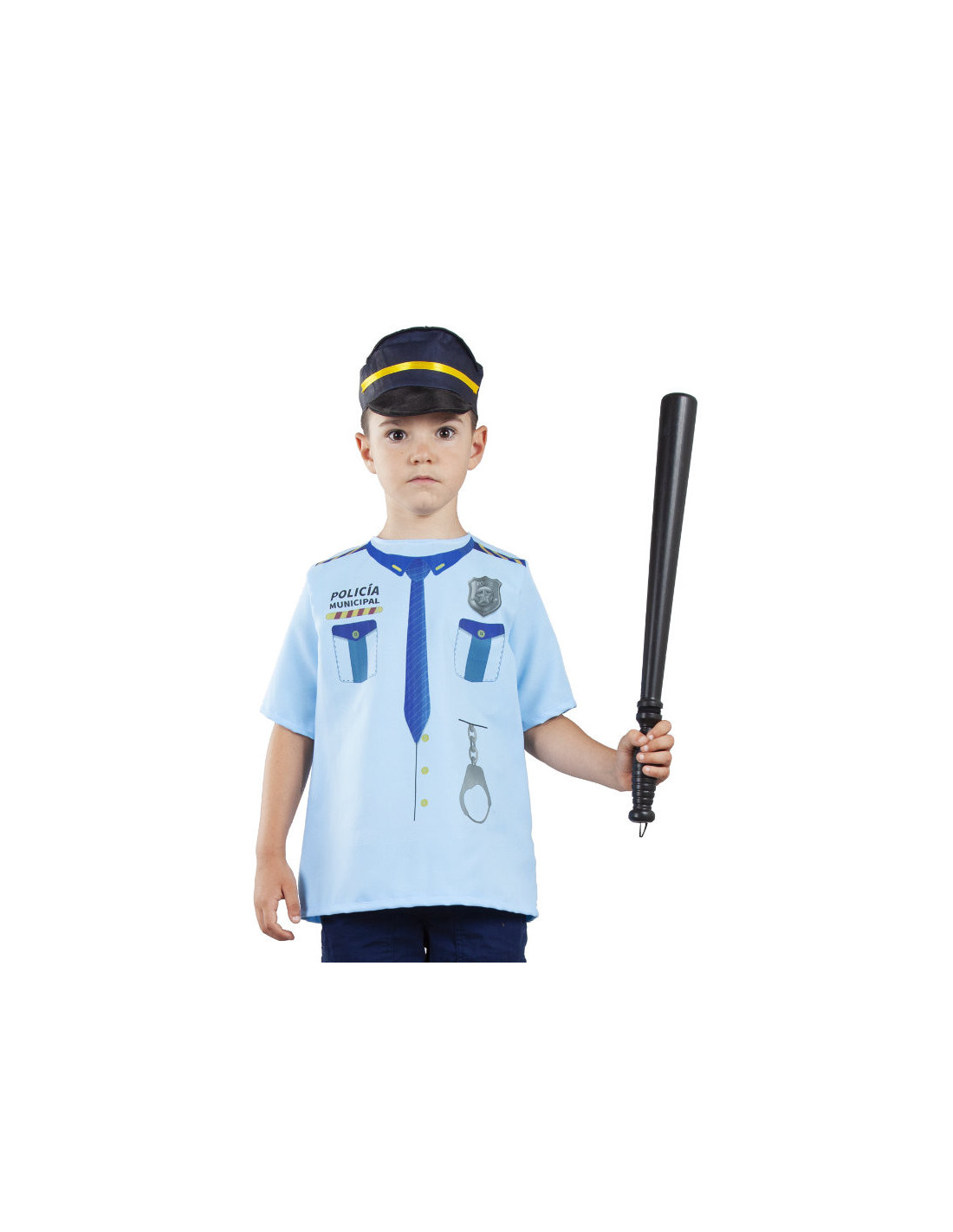 El set policía infantil contiene una camiseta de manga corta estampada y una gorra de policía azul oscura con detalle en dorado.