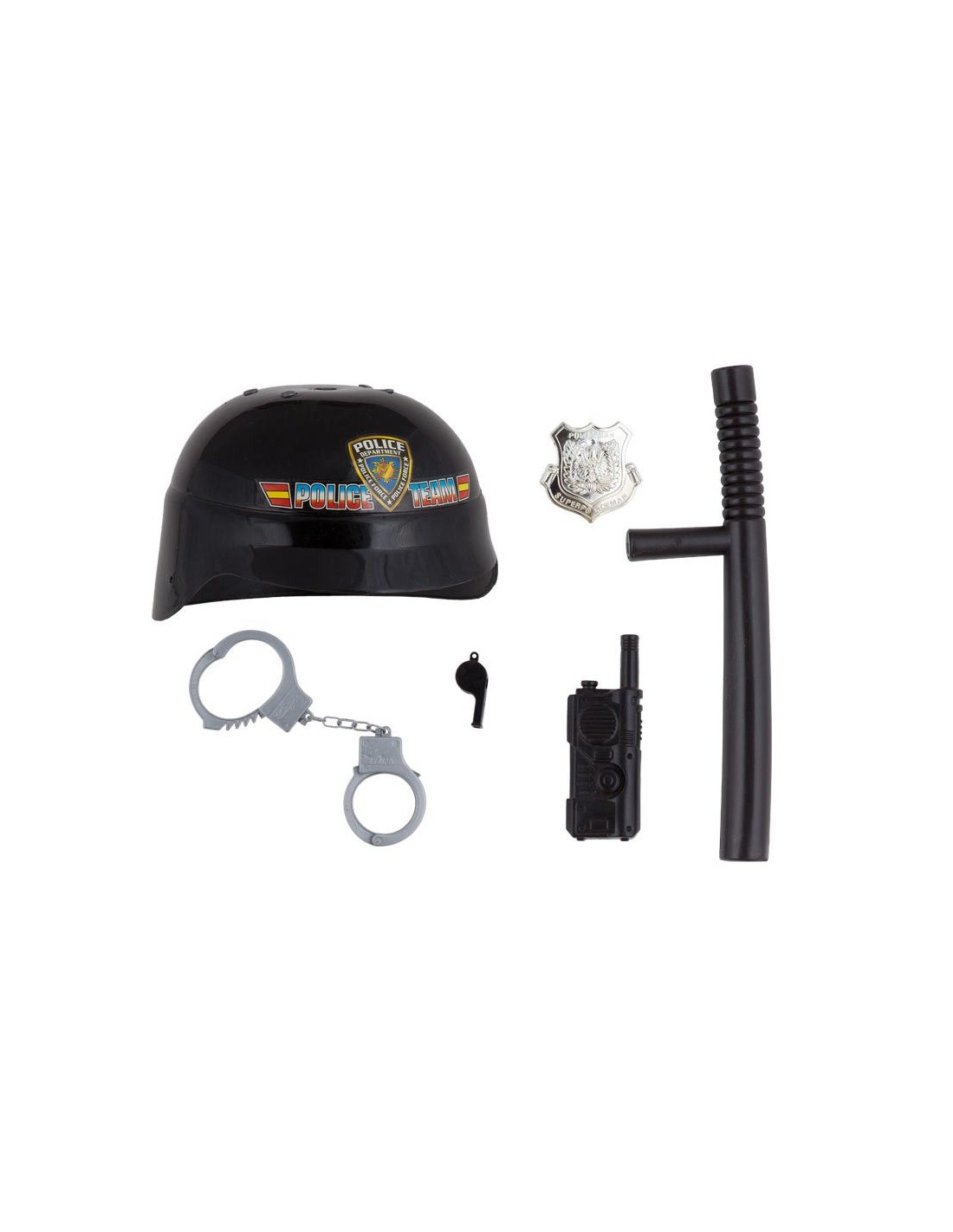 Set Policía para complementar tu disfraz de policía y que no se te escape ningún ladrón. Incluye: porra, placa, esposas, walkie, pito y casco.