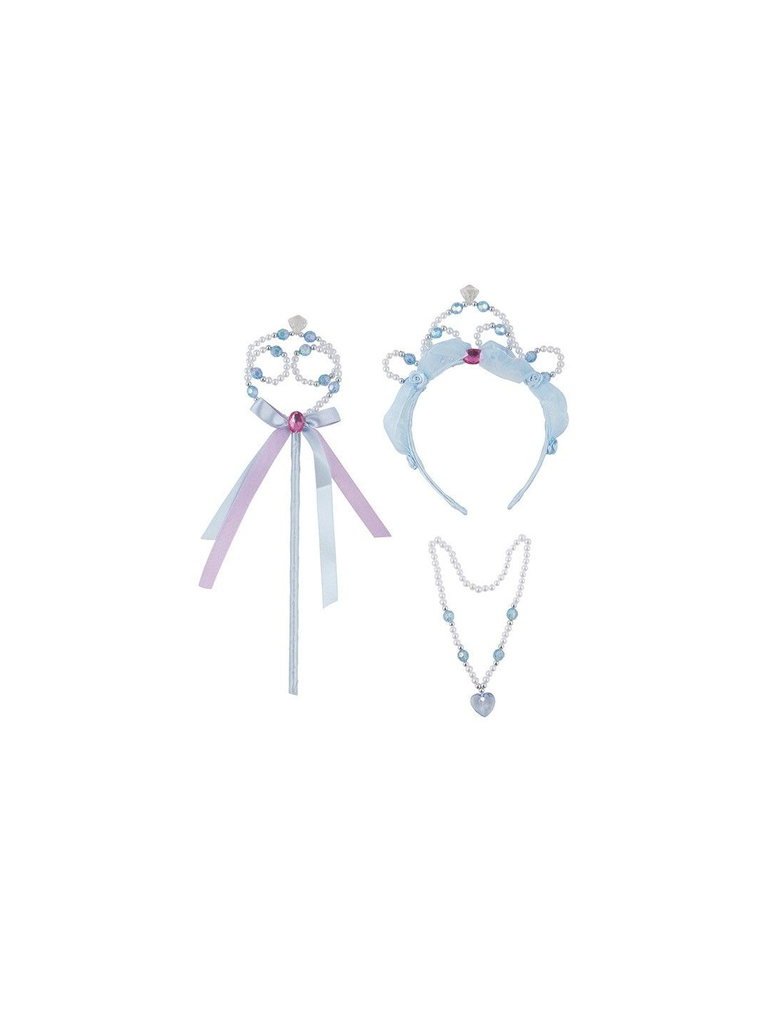 Contiene diadema con corona, collar y varita con una altura de 31cm. Todo ello decorado con perlas y piedras de colores.