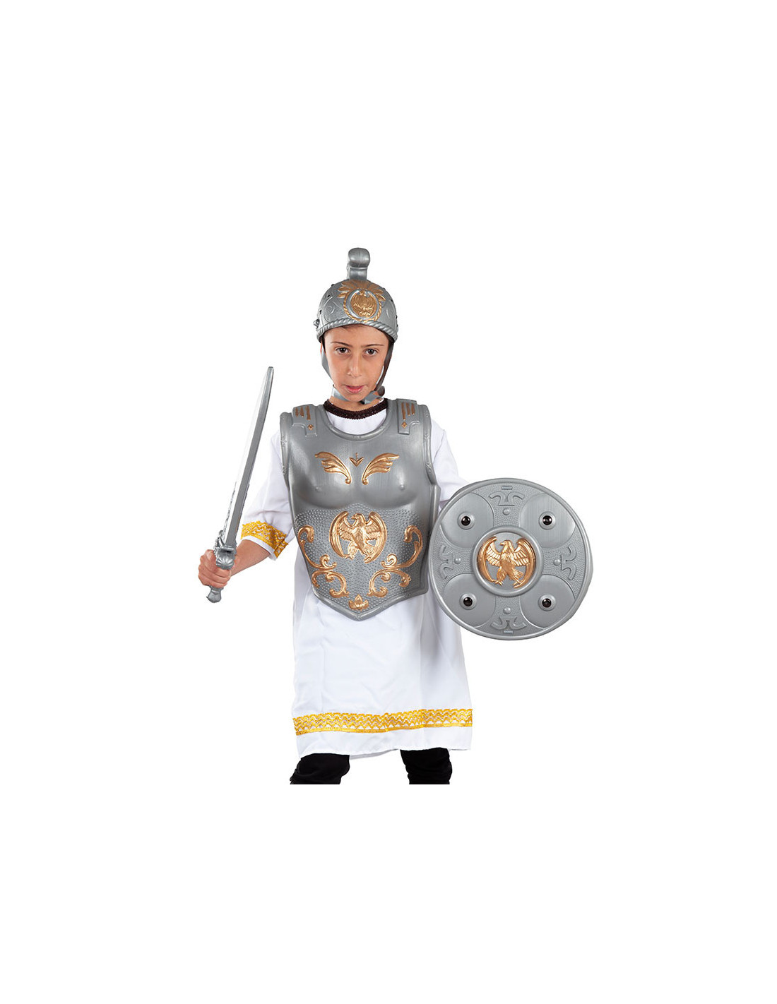 Set romano infantil que incluye espada, armadura delantera, escudo y casco de plástico.