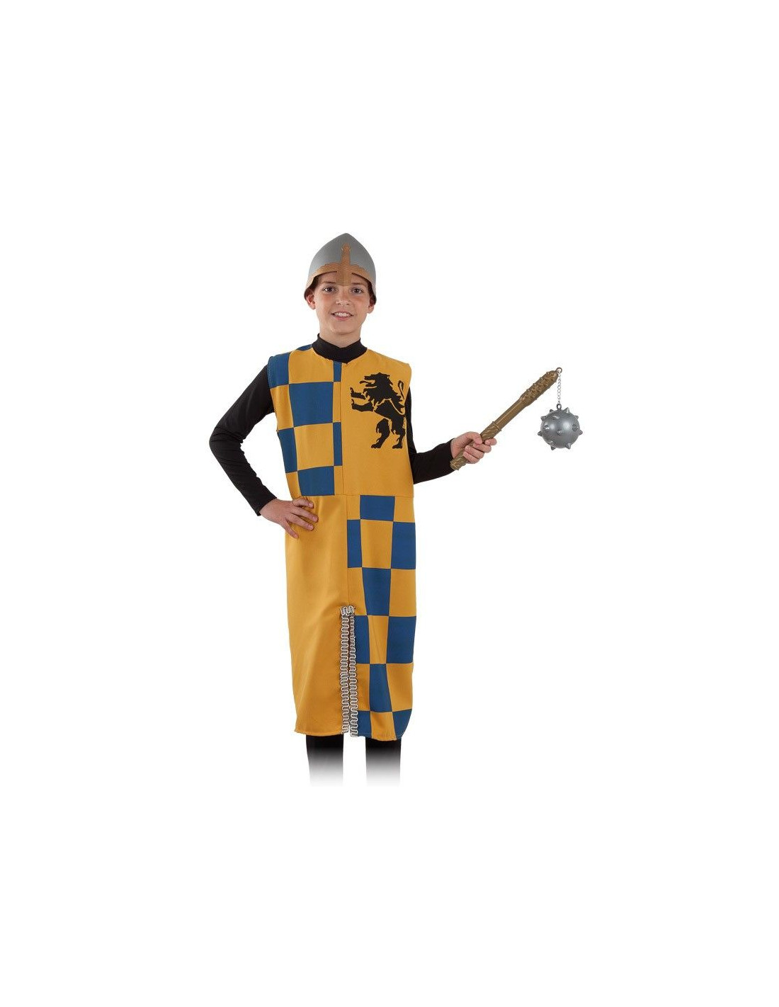 Sobrevesta medieval para niño, fabricada en strecht de color amarillo/mostaza, que cuenta con un estampado ajedrezado azul y un león rampante en la parte del pecho. Sin mangas. Disponible en varias tallas.