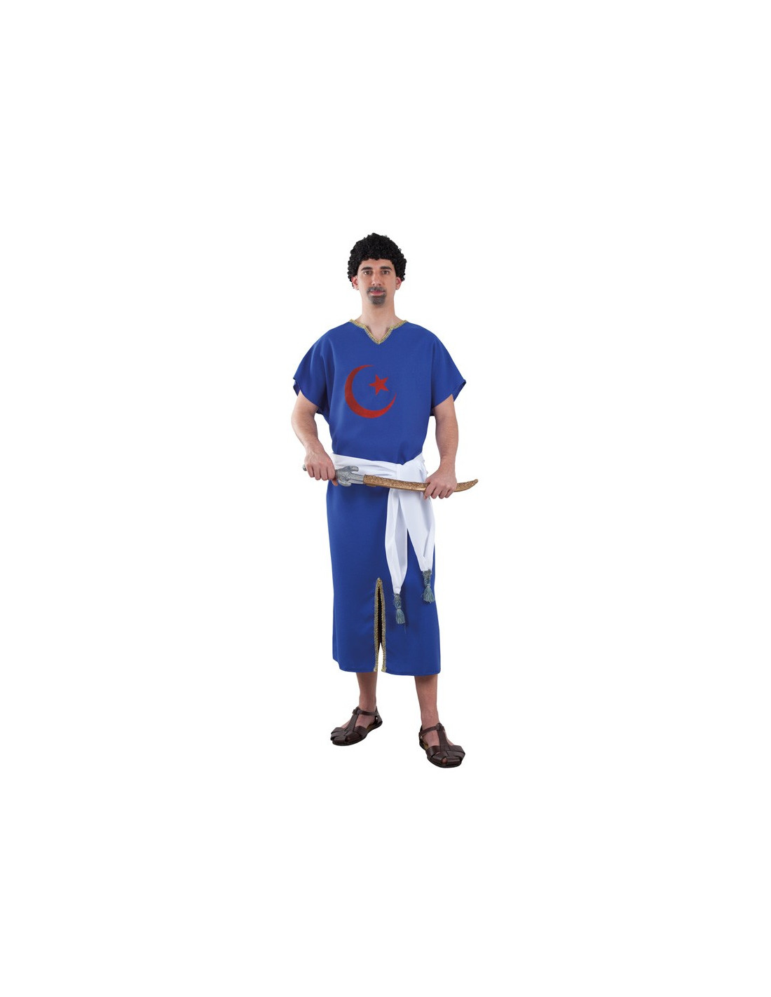 Recrea las guerras de la Reconquista entre moros y cristianos con este magnífica sobrevesta medieval morisca. Compuesta por una única túnica de color azul, con los bordes en dorado y el símbolo de la media luna y estrella estampados en color rojo sobre la parte frontal, este traje te transportará directamente a uno de los momentos más críticos de la Historia de España.