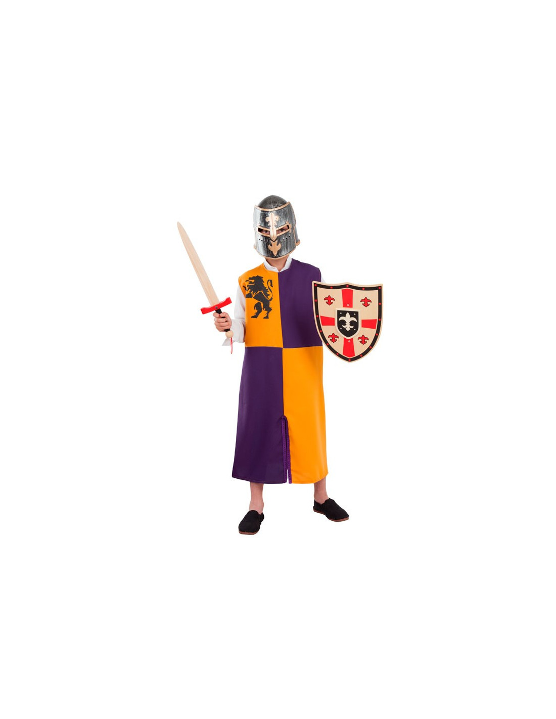 Sobrevesta naranja medieval infantil que incluye túnica sin mangas naranja y morada con un león estampado.