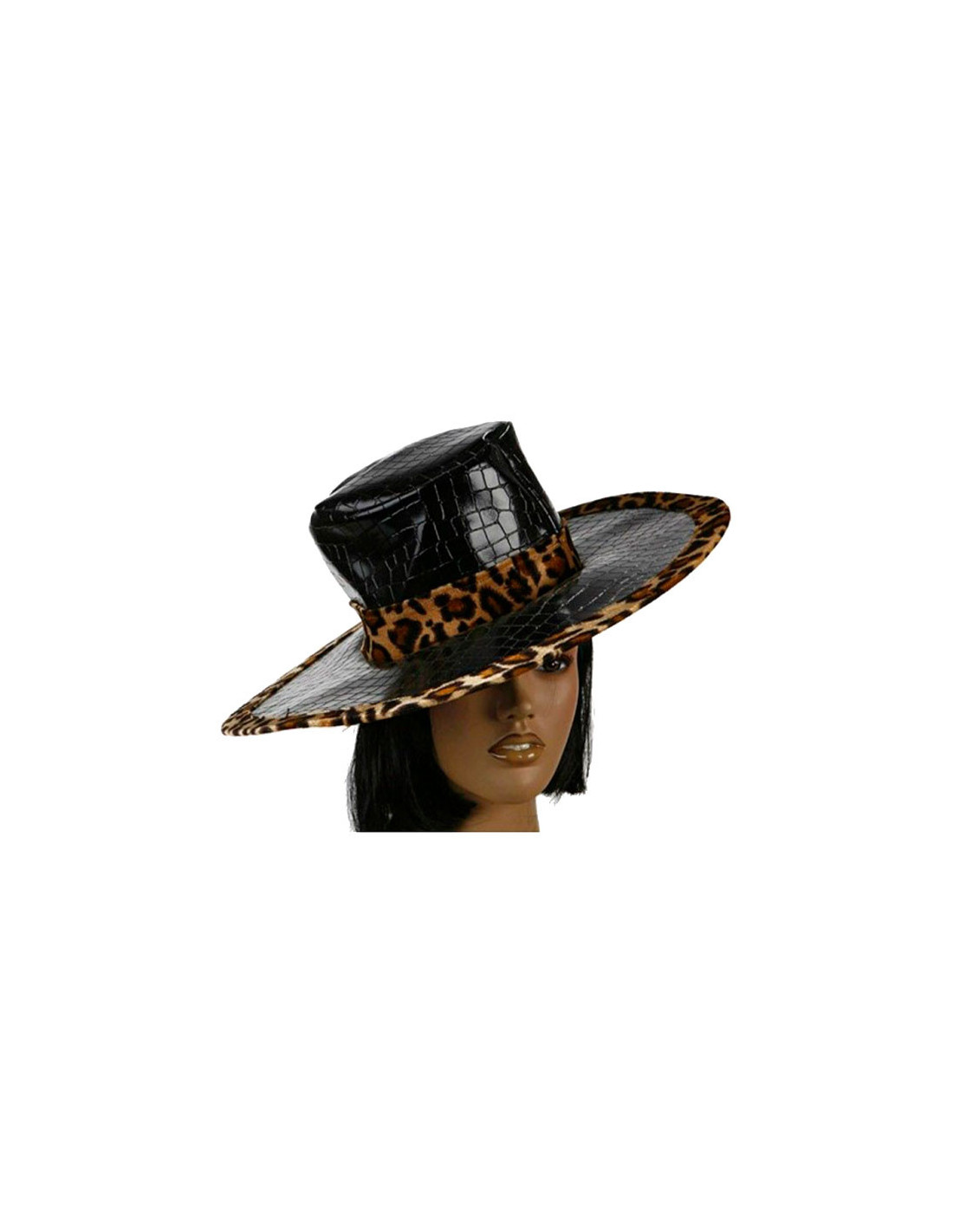 Vuelve a la época de los gángsters, música disco o disfruta de una carrera de Ascott como una gran diva del cine con este sombrero disco para mujer de ala ancha. Fabricado en polipiel negra. Incluye sombrero para mujer de ala grande con cinta de pelo simulando la piel de leopardo. Ideal para tus disfraces de época para mujer mafiosa.