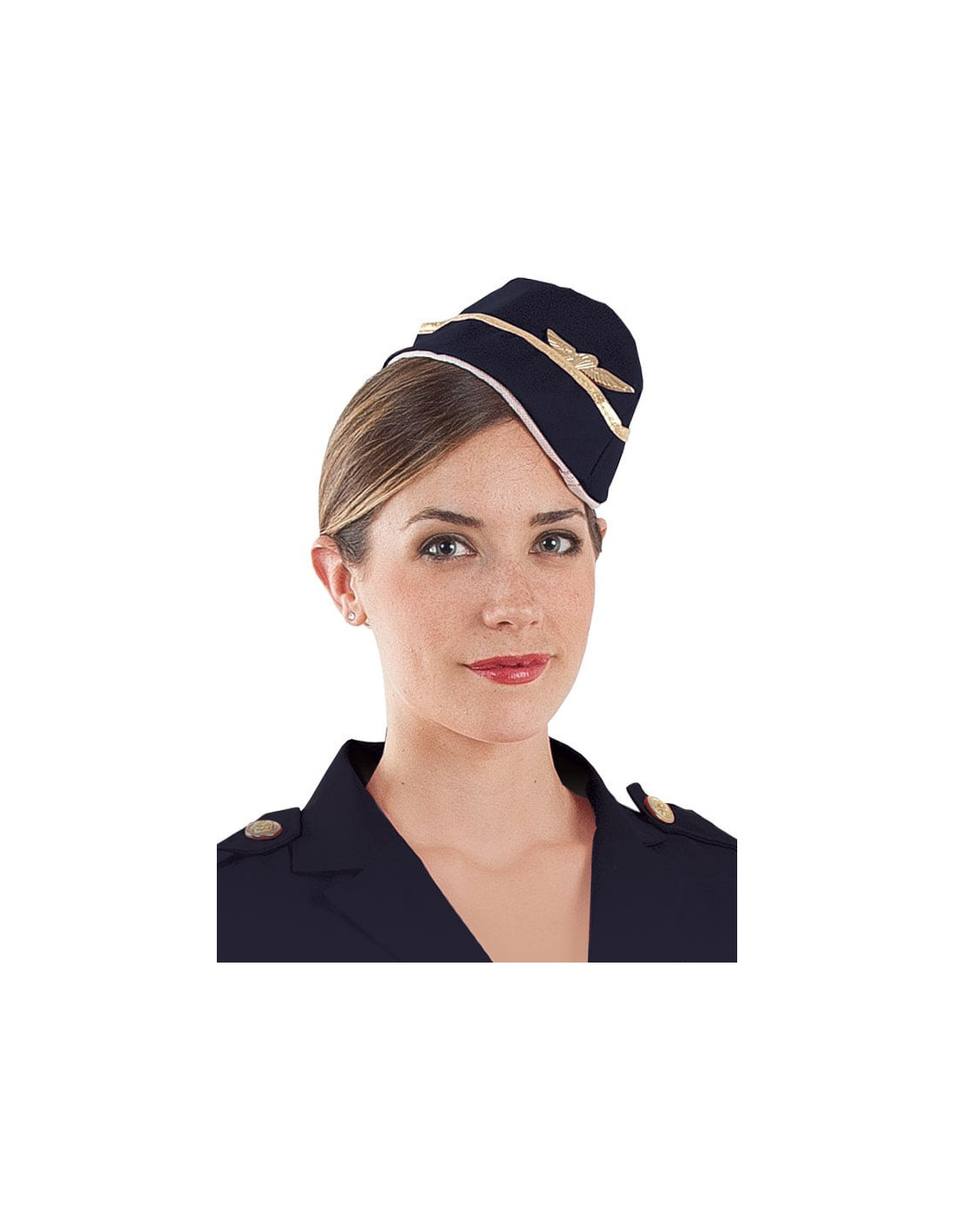 Serás la más elegante de la tripulación con este sombrero de azafata. Ideal para completar tu traje de tripulación de vuelo, este sombrero de azafata fabroicado de tela, está disponible en color azul marino con detalles dorados.