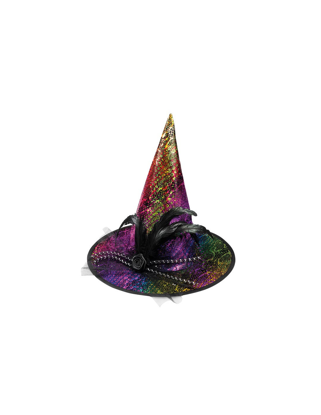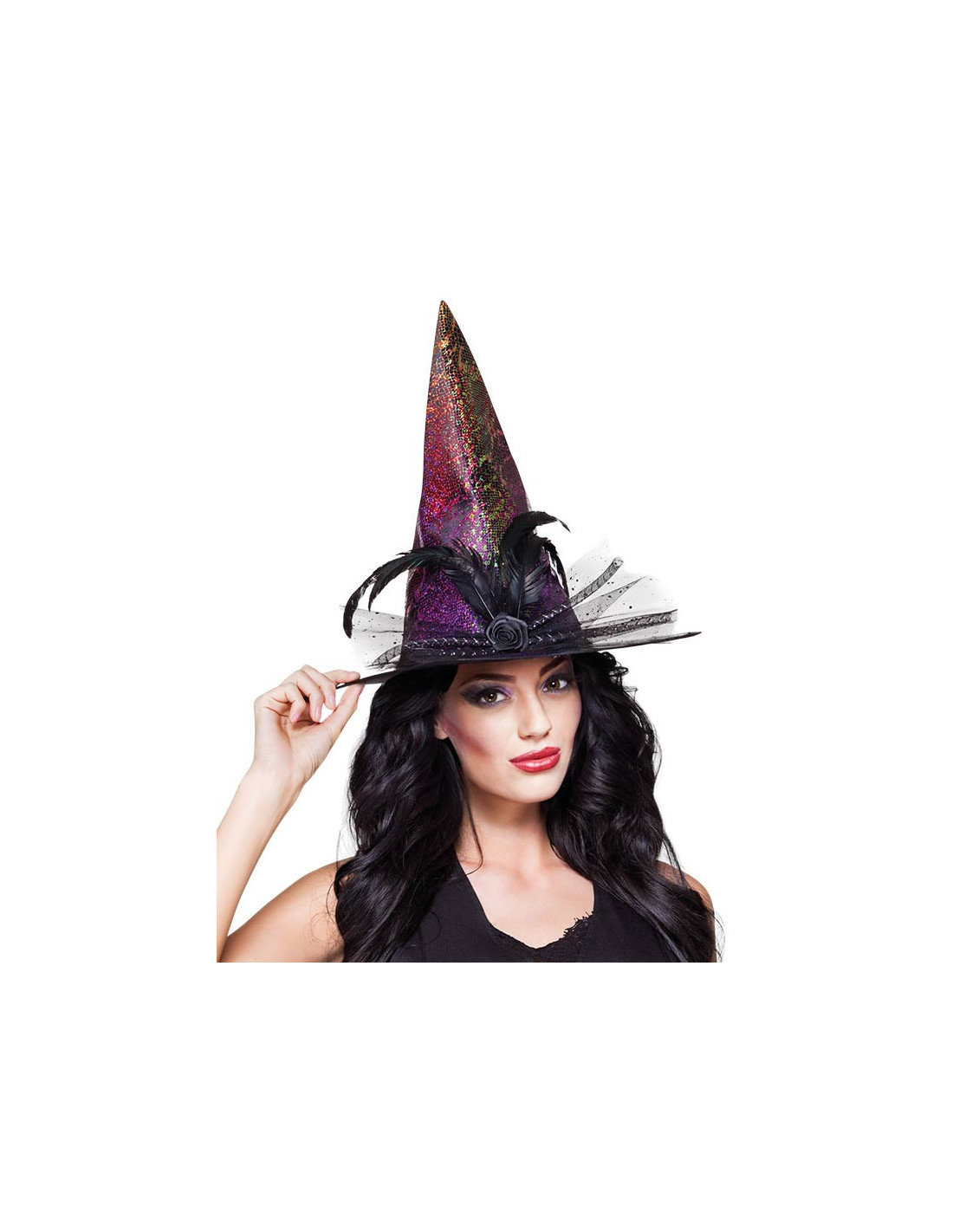 Elegante sombrero bruja irisado para completar tu disfraz de hechicera en Halloween o Fiestas Temáticas.